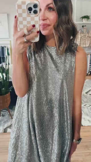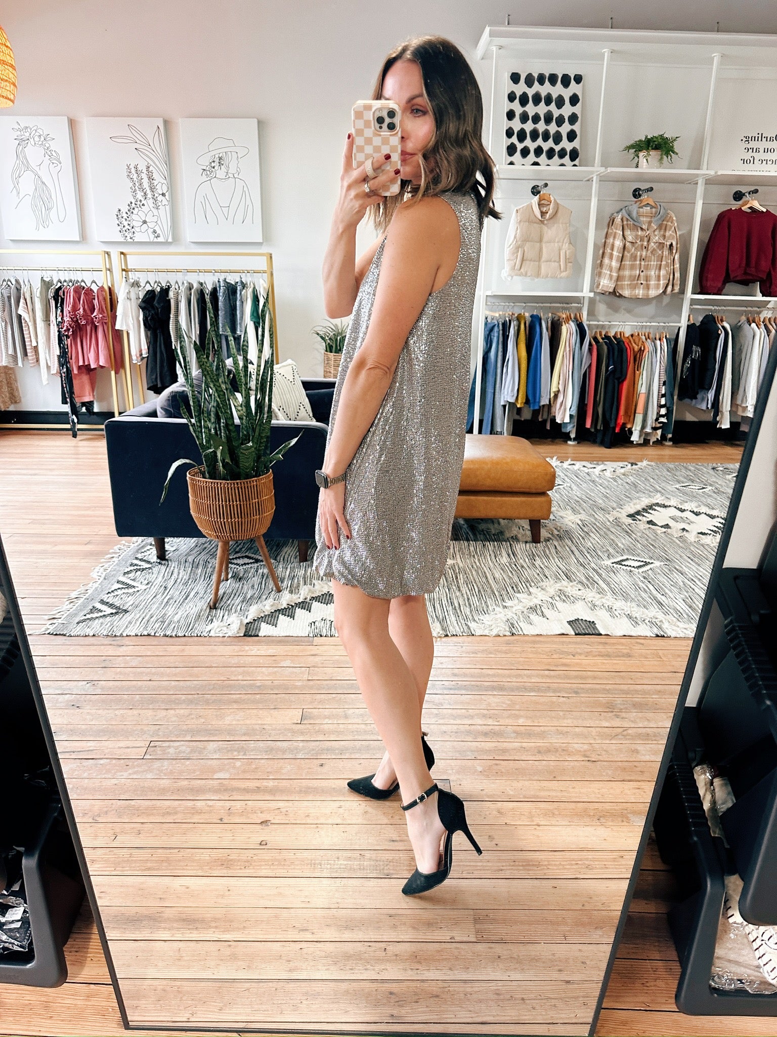 We are obsessed with this dress for the holiday season! This is a shimmery style fabric with a bubble bottom hem and true to size fit. This is sleeveless, but works with a standard bra, and can be paired with heels or boots!