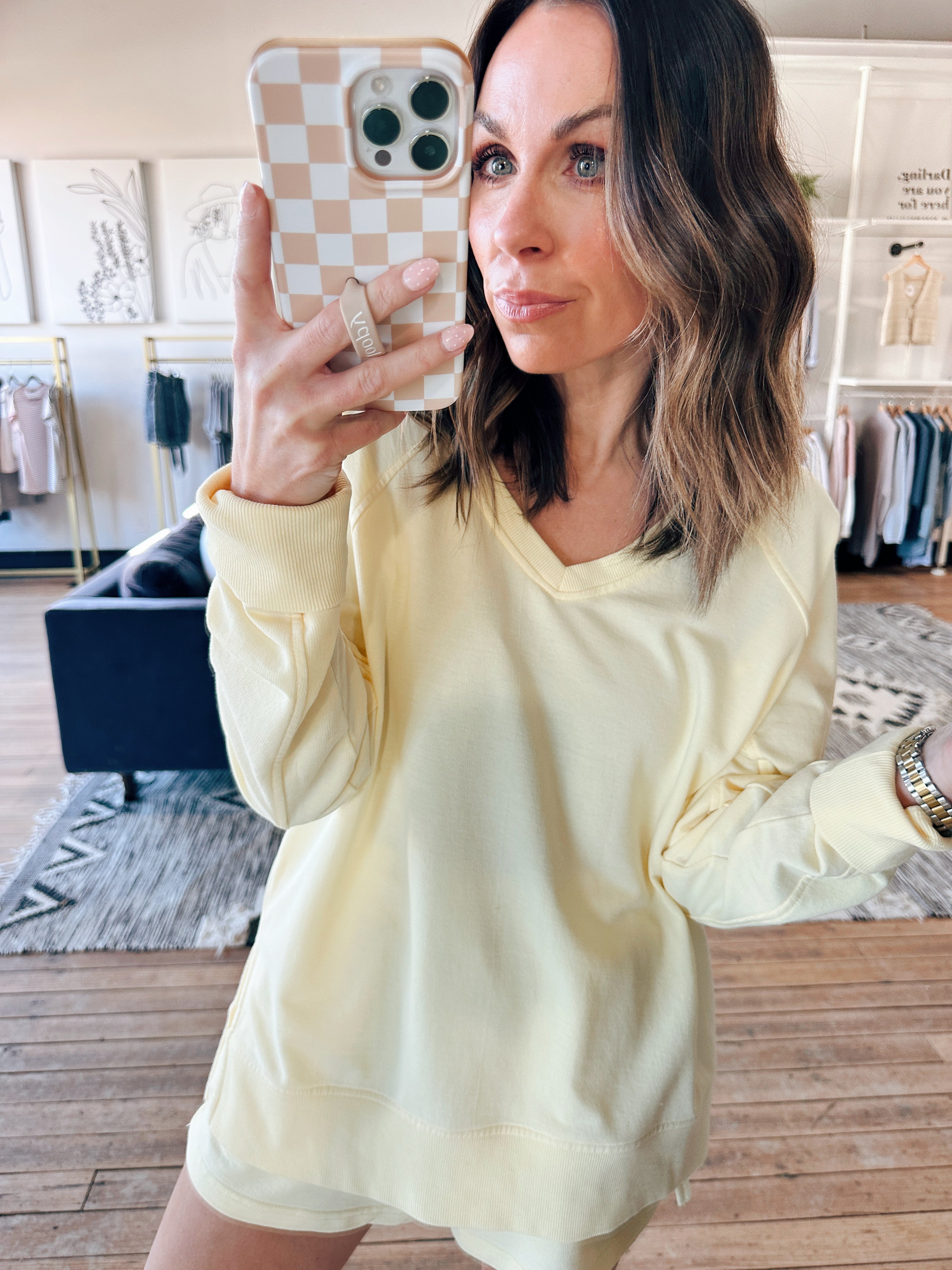 The Z Supply Weekender V-Neck is a beautiful soft baby French terry knit long-sleeve sweatshirt featuring a flattering V-neckline, side seam slit detail, and a perfectly relaxed silhouette. It fits relaxed with an easy, laid-back feel — perfect for lounging, errands, travel days, or everyday wear. Made from a midweight, breathable knit with a burnout wash, this piece adds effortless comfort with an elevated, lived-in look.