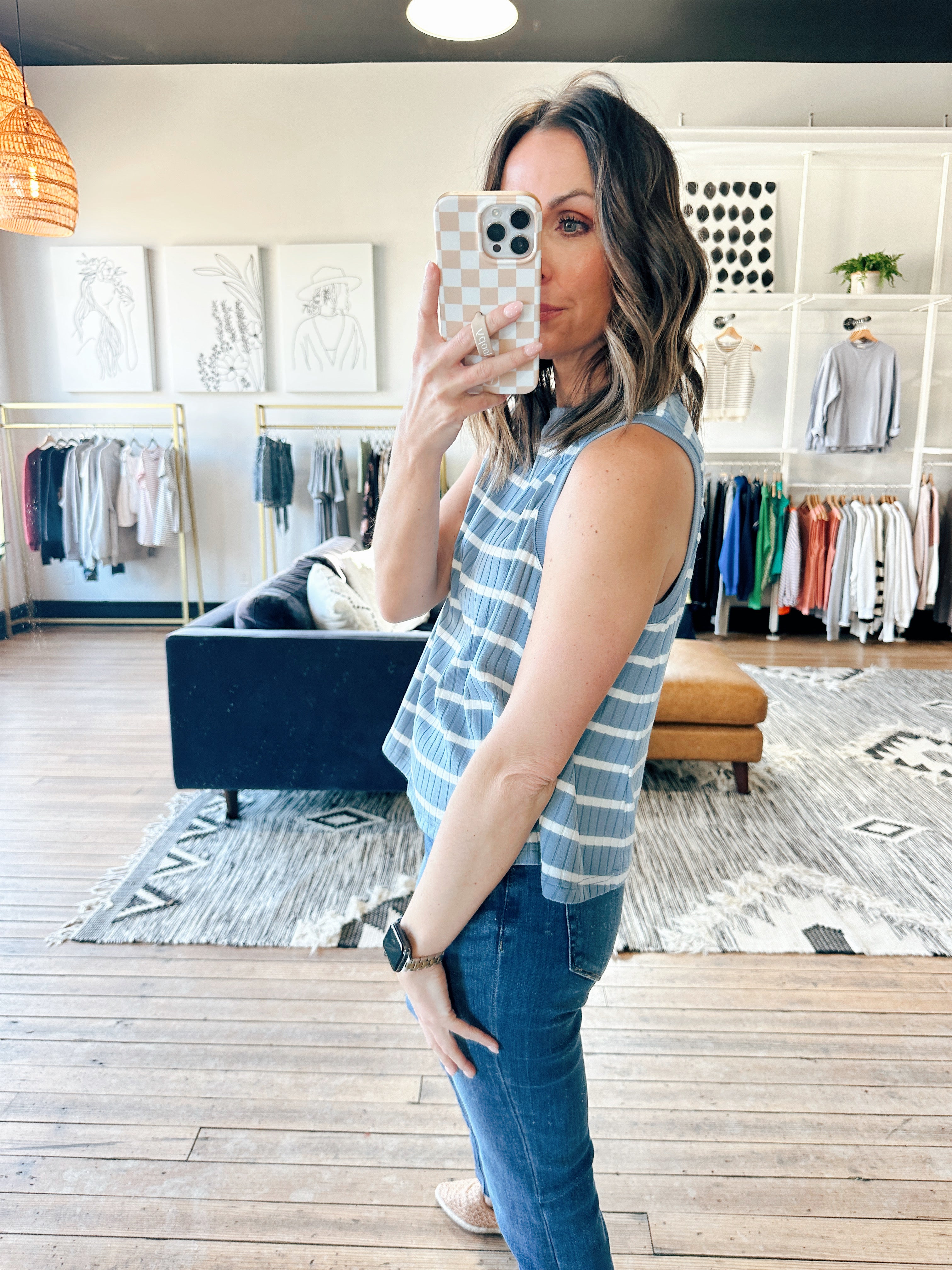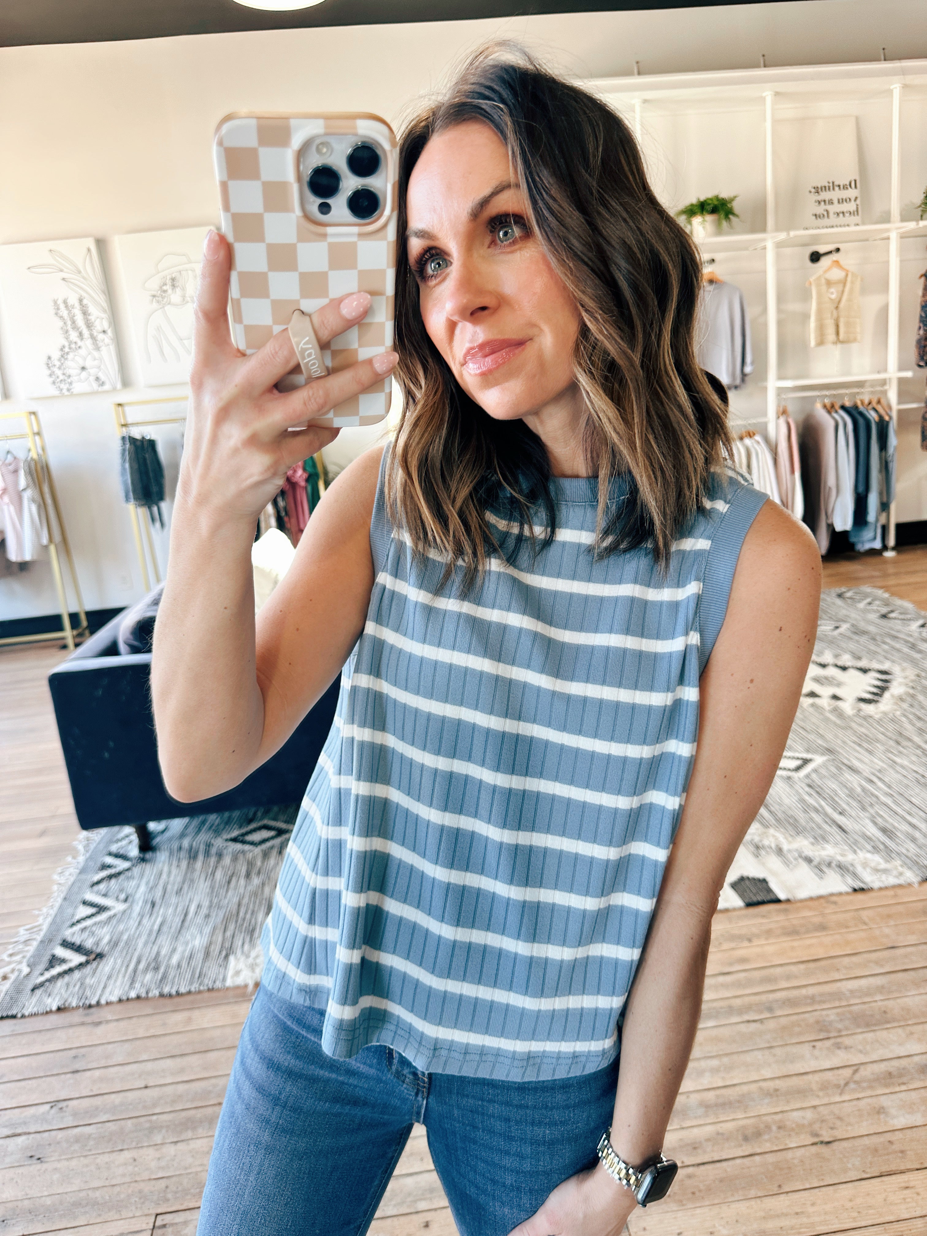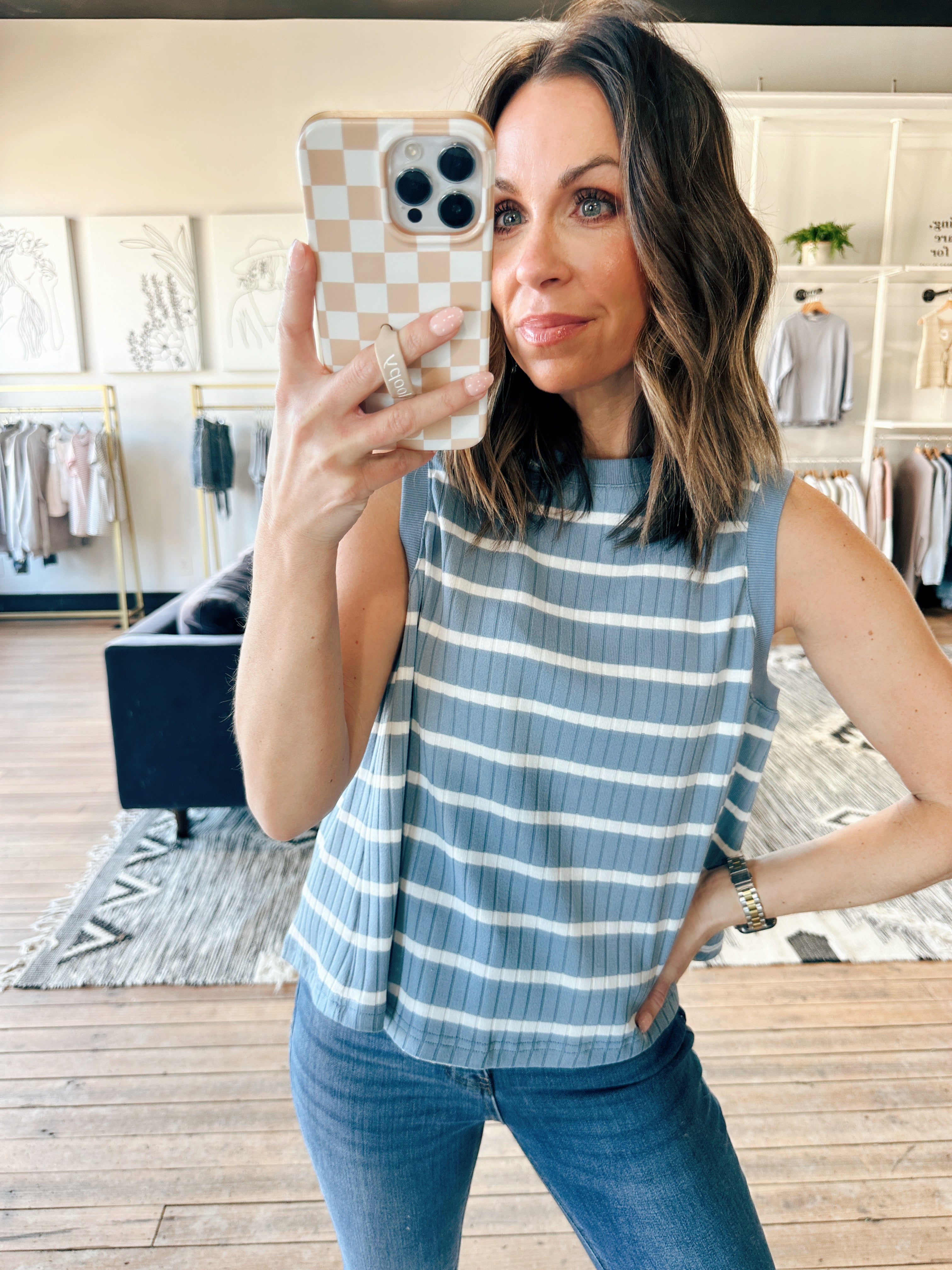 The Wishlist Faye Striped Ribbed Tank is a beautiful ribbed knit everyday tank featuring classic stripe detailing, a flattering fitted silhouette, and easy, versatile wear. It fits true to size with a comfortable, body-skimming shape — perfect for layering, warm days, errands, or everyday wear. Made from a stretchy ribbed fabric, this piece adds an effortless yet elevated touch to denim, shorts, or skirts.