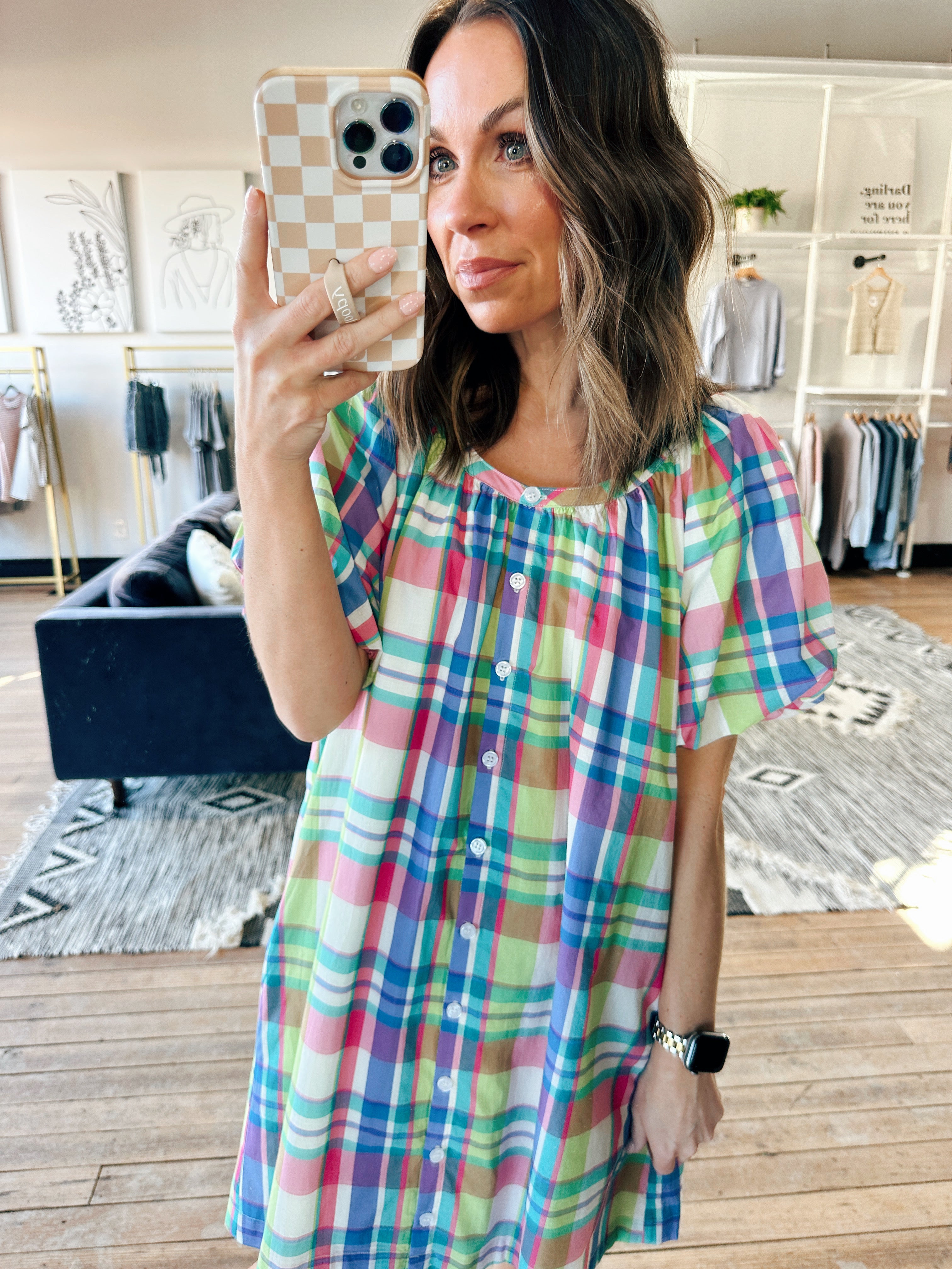 The Wishlist Kate Multicolor Mini Dress is a beautiful lightweight woven plaid mini dress featuring a colorful multicolor plaid pattern, functional button-front detail, and easy everyday charm. It fits true to size with a flattering, effortless silhouette — perfect for brunch, casual outings, errands, or everyday wear. Made from a comfortable woven fabric with lining, this piece adds a playful yet polished touch you can dress up or down.