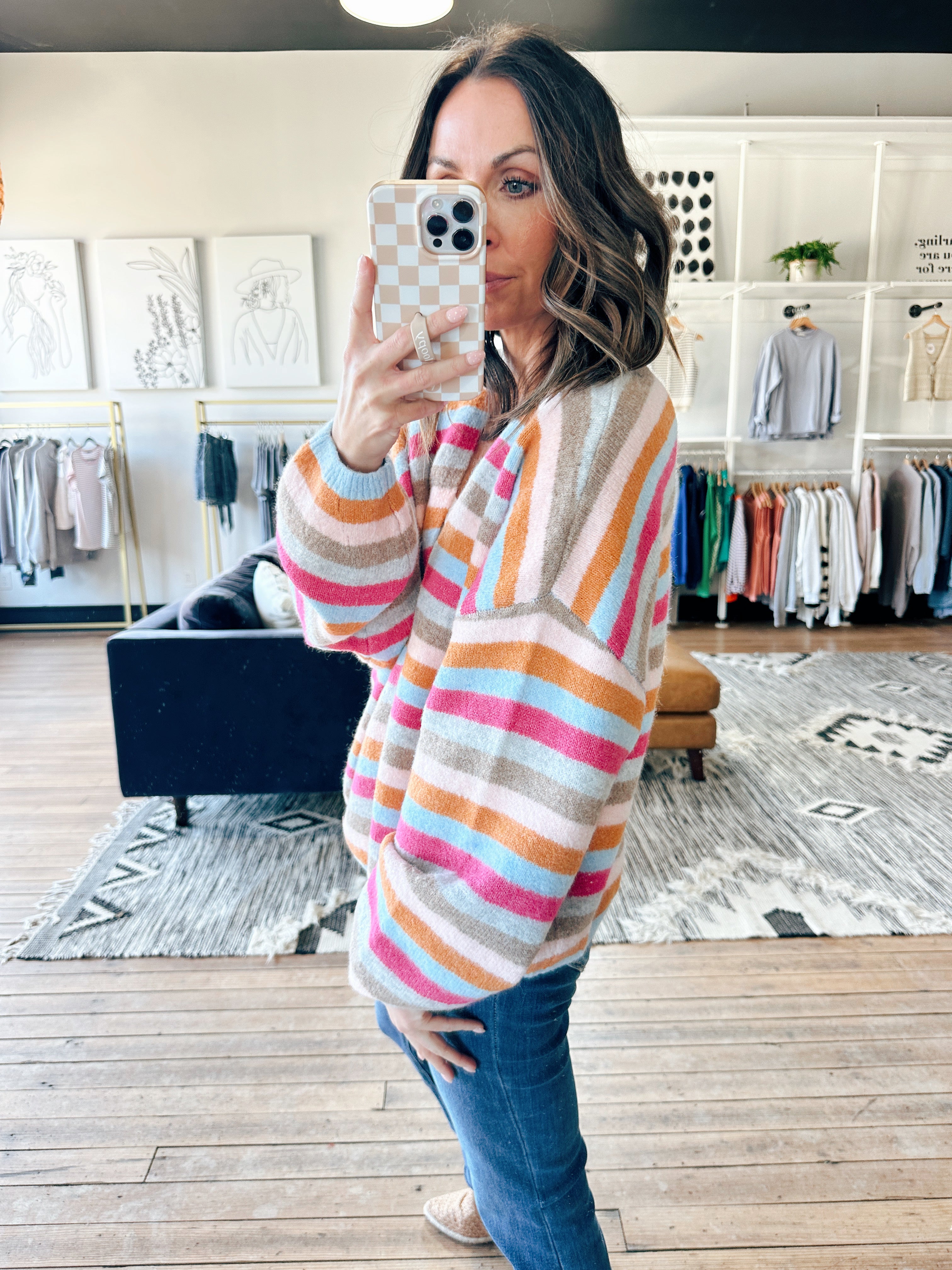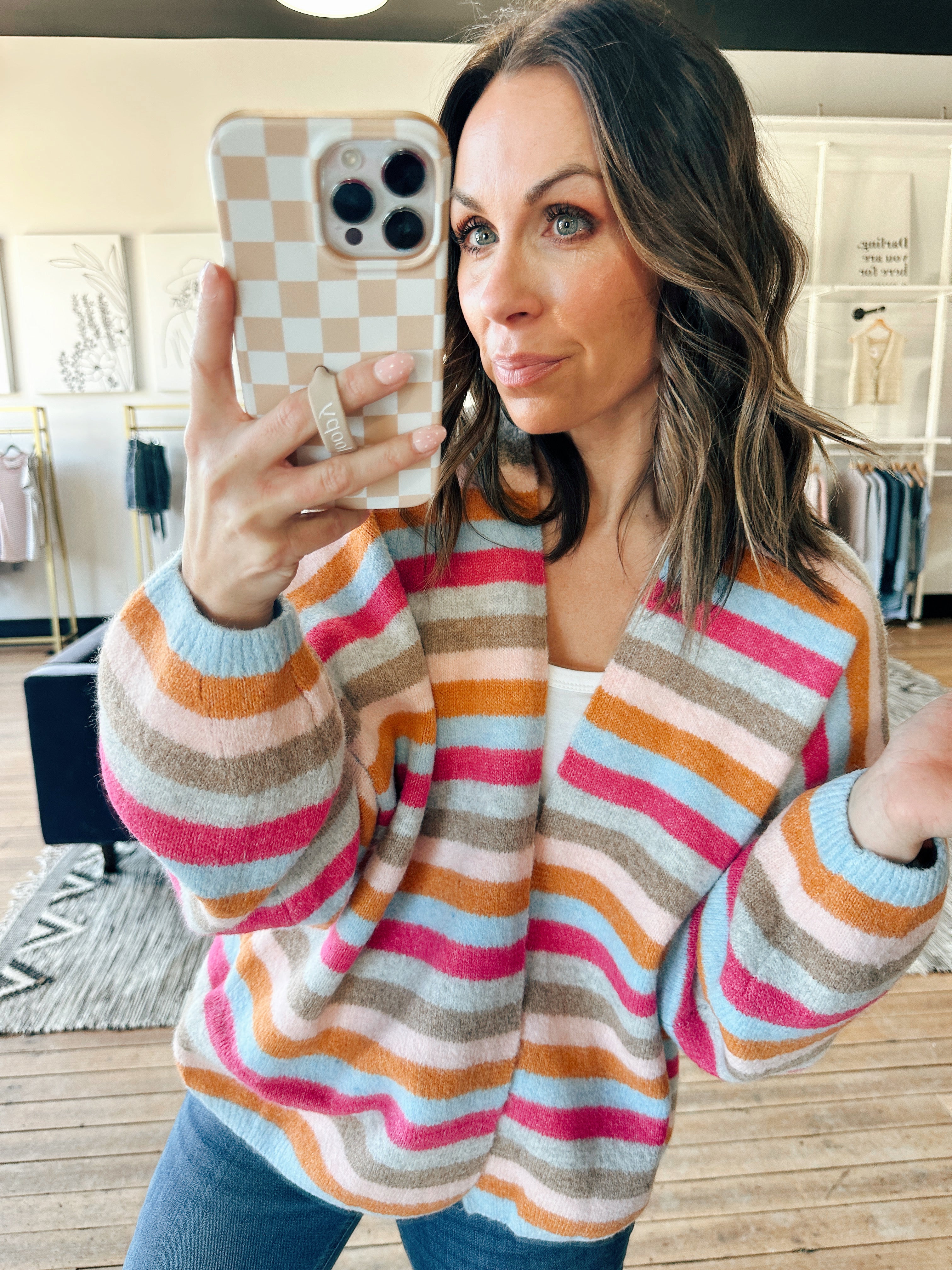 The Wishlist Arlette Striped Sweater Cardigan is a beautiful soft sweater knit multicolor striped cardigan featuring eye-catching stripe detailing, a cozy open-front style, and an easy, everyday silhouette. It fits true to size with a relaxed, flattering drape — perfect for layering, casual workdays, brunch, or everyday wear. Made from a soft, stretchy sweater knit, this piece adds an effortless pop of color to denim or tailored bottoms.