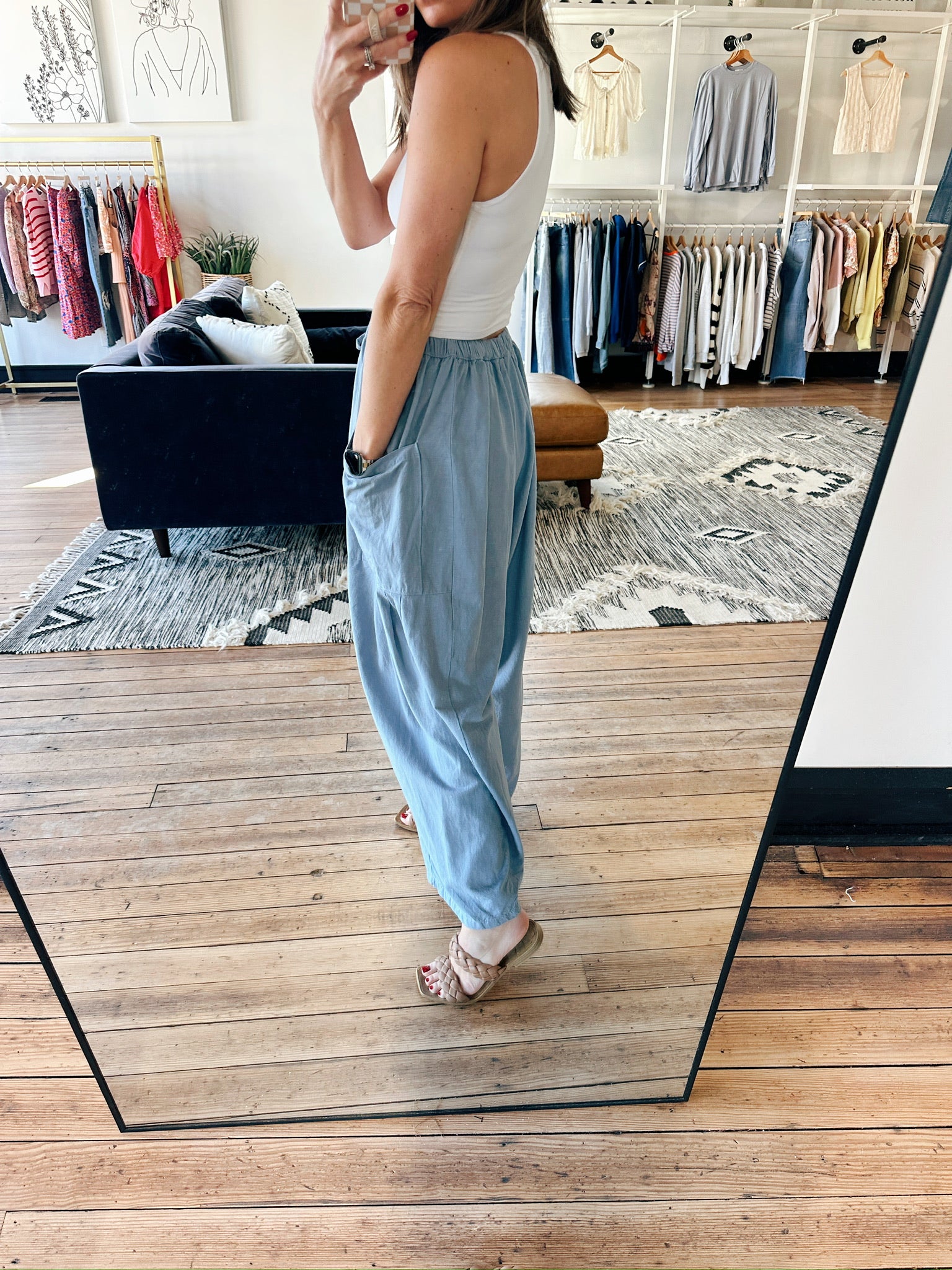 The Cotierra Zena Wide Leg Pants are a beautiful soft viscose-linen blend wide-leg pant featuring a billowy harem-inspired silhouette, an elastic waistband with drawstring, and easy dropped side pockets. They fit true to size with a relaxed, flowy drape — perfect for travel days, vacations, errands, or everyday wear. Made from a lightweight yarn-dyed viscose-linen fabric, this piece offers breathable comfort while delivering effortless style.