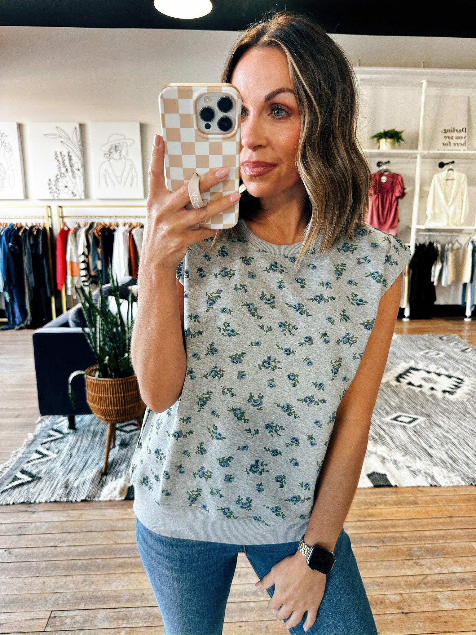 Fresh, feminine, and effortlessly chic — the Belrose Floral Pull-Over is the perfect everyday piece for women who love casual comfort with a touch of charm. Designed in a heather gray base with delicate blue floral print, this sleeveless pullover offers a lightweight feel that transitions seamlessly from season to season.