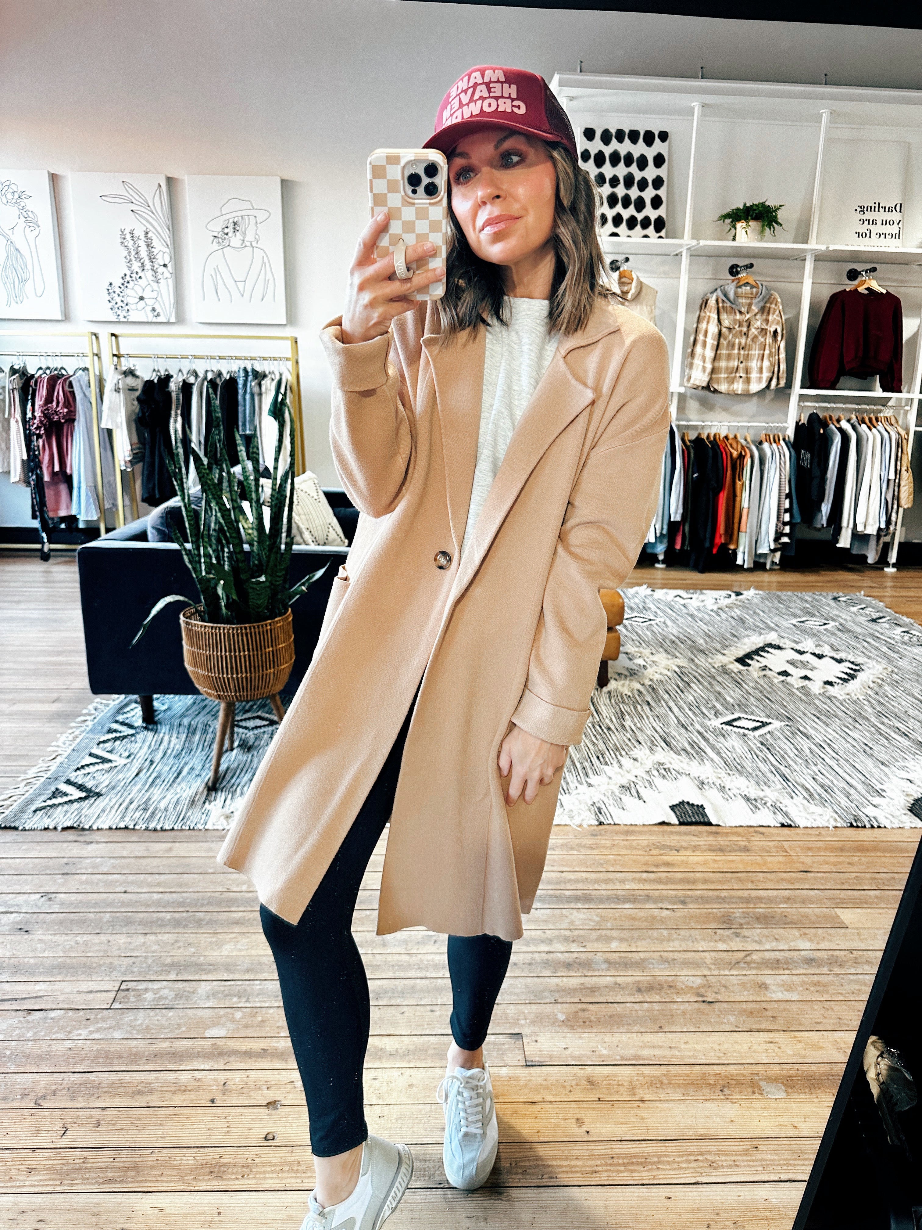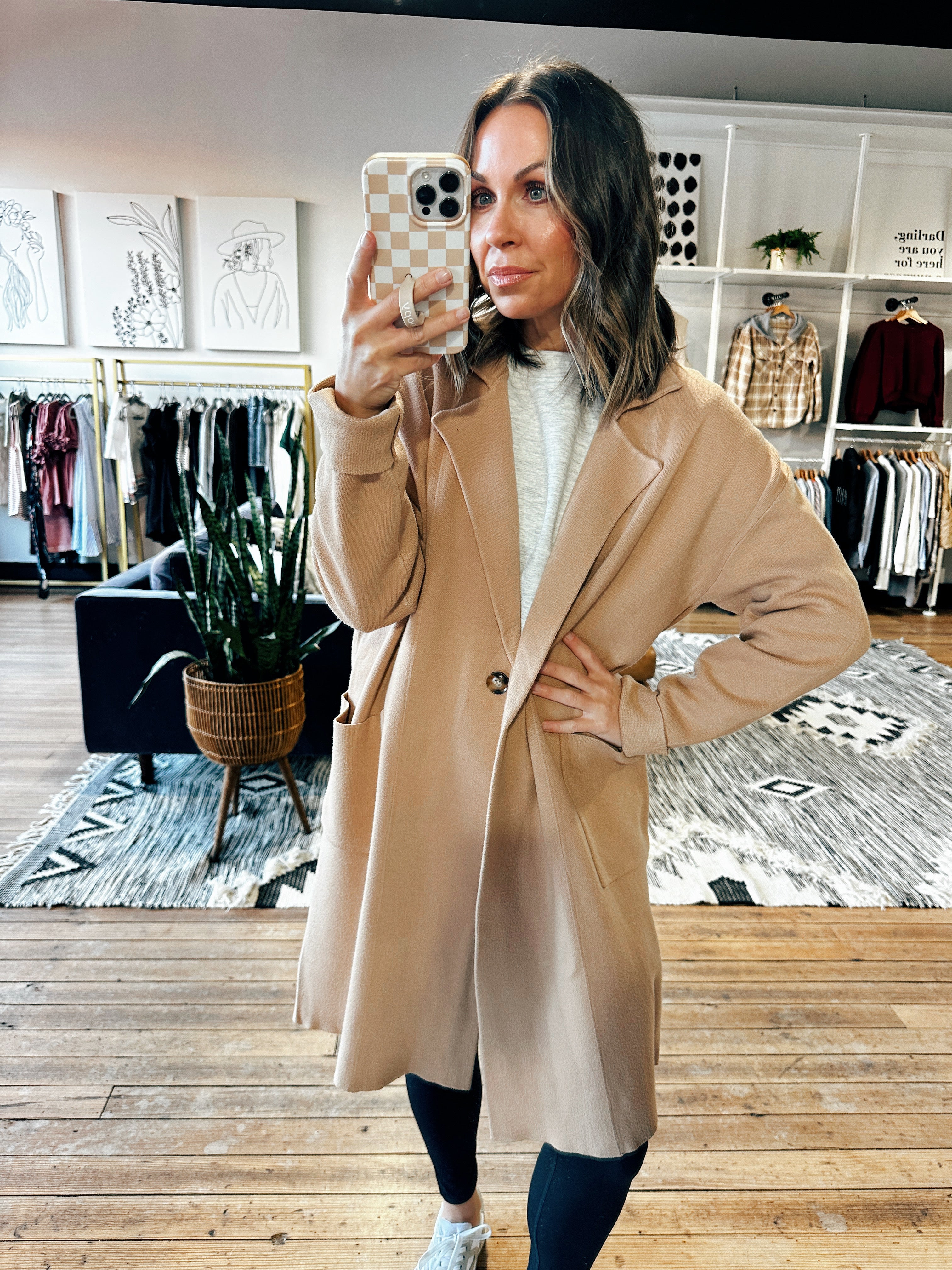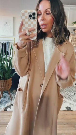 Elevate your everyday layers with the Denise Soft Sweater Coatagin — the perfect blend of coat structure and cardigan comfort. This camel-colored women’s coatagin drapes beautifully with its relaxed fit, open front with single-button closure, and cozy sweater-like softness. Designed for the modern woman who loves timeless, neutral tones, this piece adds instant polish to denim, leggings, or your favorite fall dress.