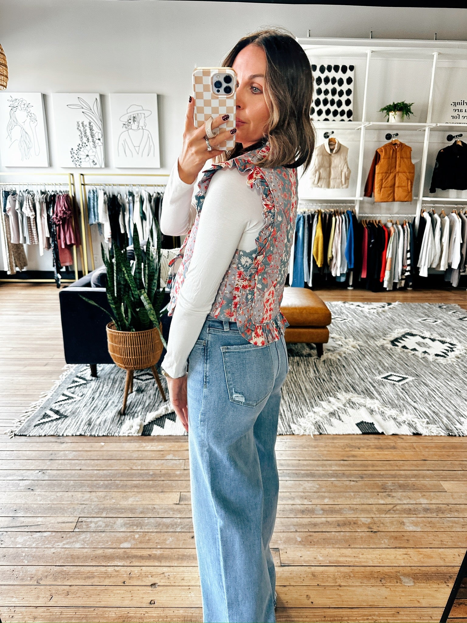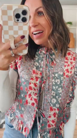 The patchwork trend is big this year and this is the most darling patchwork vest! This fits true to size with ruffle detailing and ties down the front. This is a fun option to pair with a tee and denim or a skirt for a super cute look!