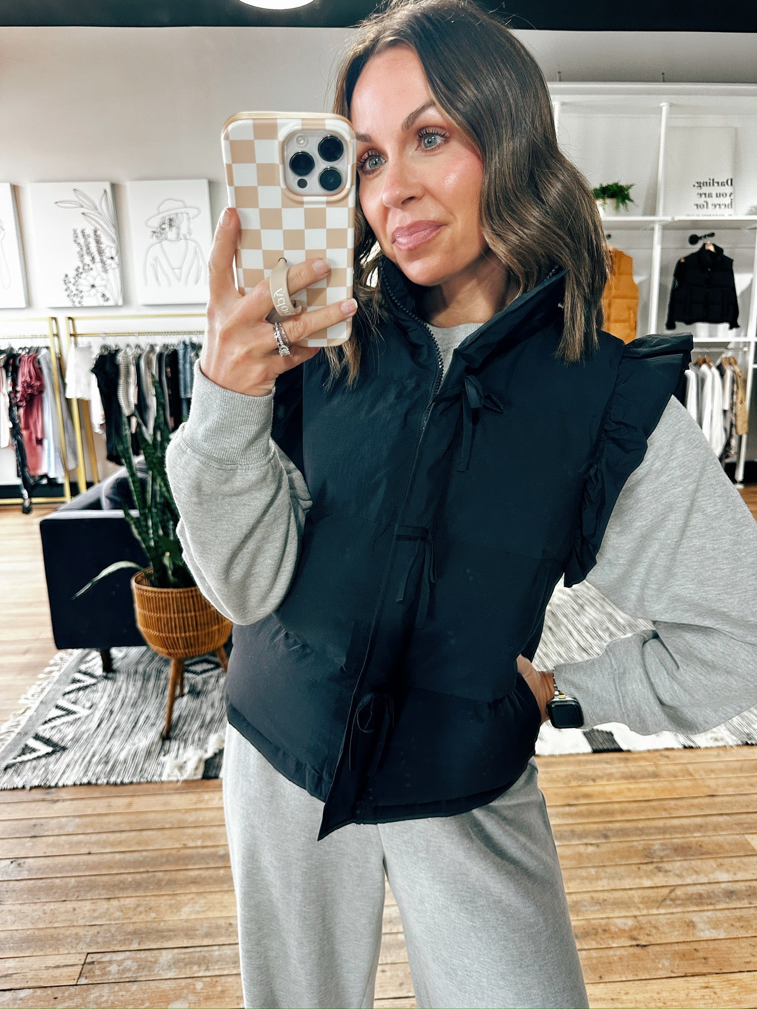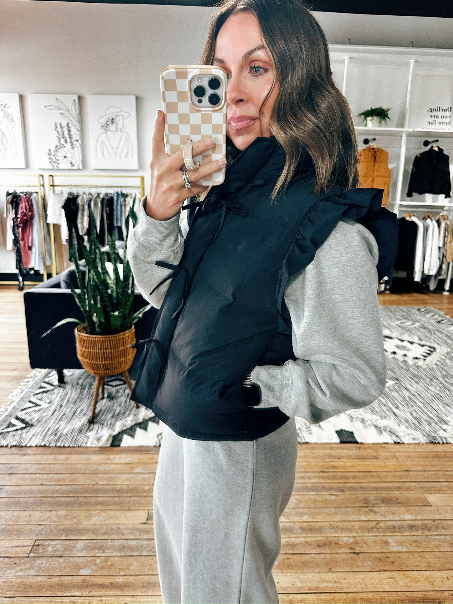 Stay cozy in this front bow ruffle sleeve puffer vest, designed with a playful boho touch. Featuring a mock neck, front zipper, and handy side pockets, it’s perfect for layering into women’s fall fashion and winter looks.