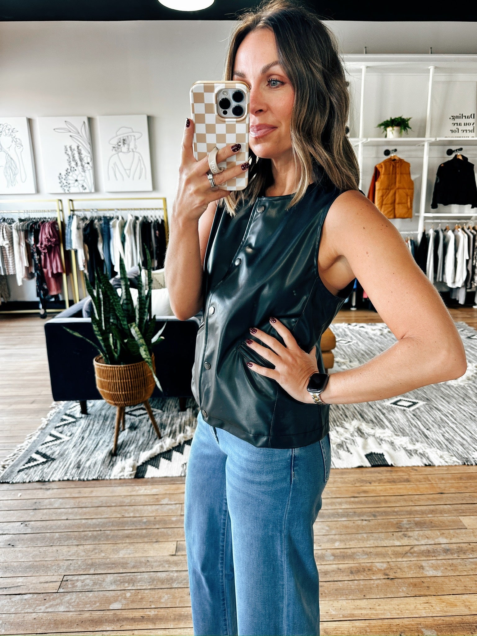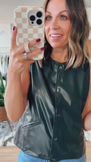 Bring a little edge to your everyday look with the Snap! Vegan Leather Vest. Made for women who love chic layering pieces, this sleek black vest is crafted from soft, cruelty-free vegan leather that looks and feels luxe. The snap-front closure and clean silhouette keep it modern, while subtle seam details add shape and style.