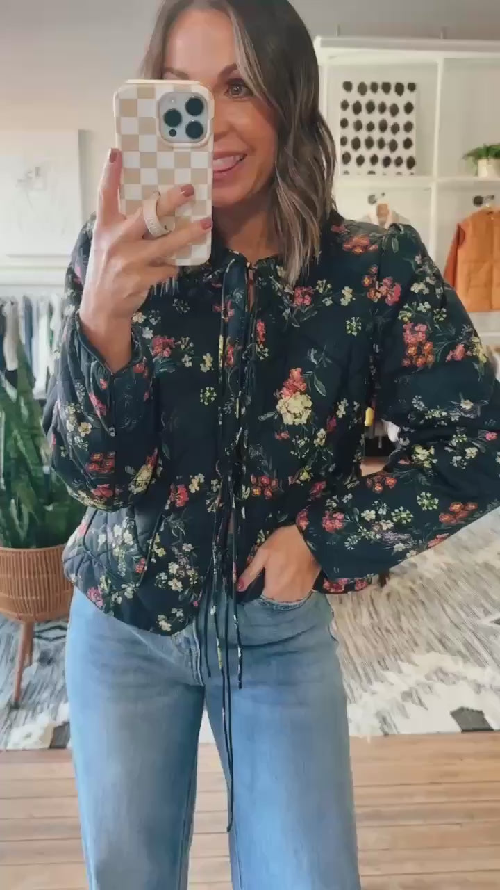 Layer up in cozy-chic style with this black quilted floral jacket designed with a timeless feminine touch. Featuring a lightweight quilted texture and vibrant yellow, pink, and red floral print, this jacket adds a pop of color to your everyday looks. The tie-front closure and roomy front pockets give it both charm and functionality, while the relaxed fit makes it perfect for layering over tees, sweaters, or dresses.