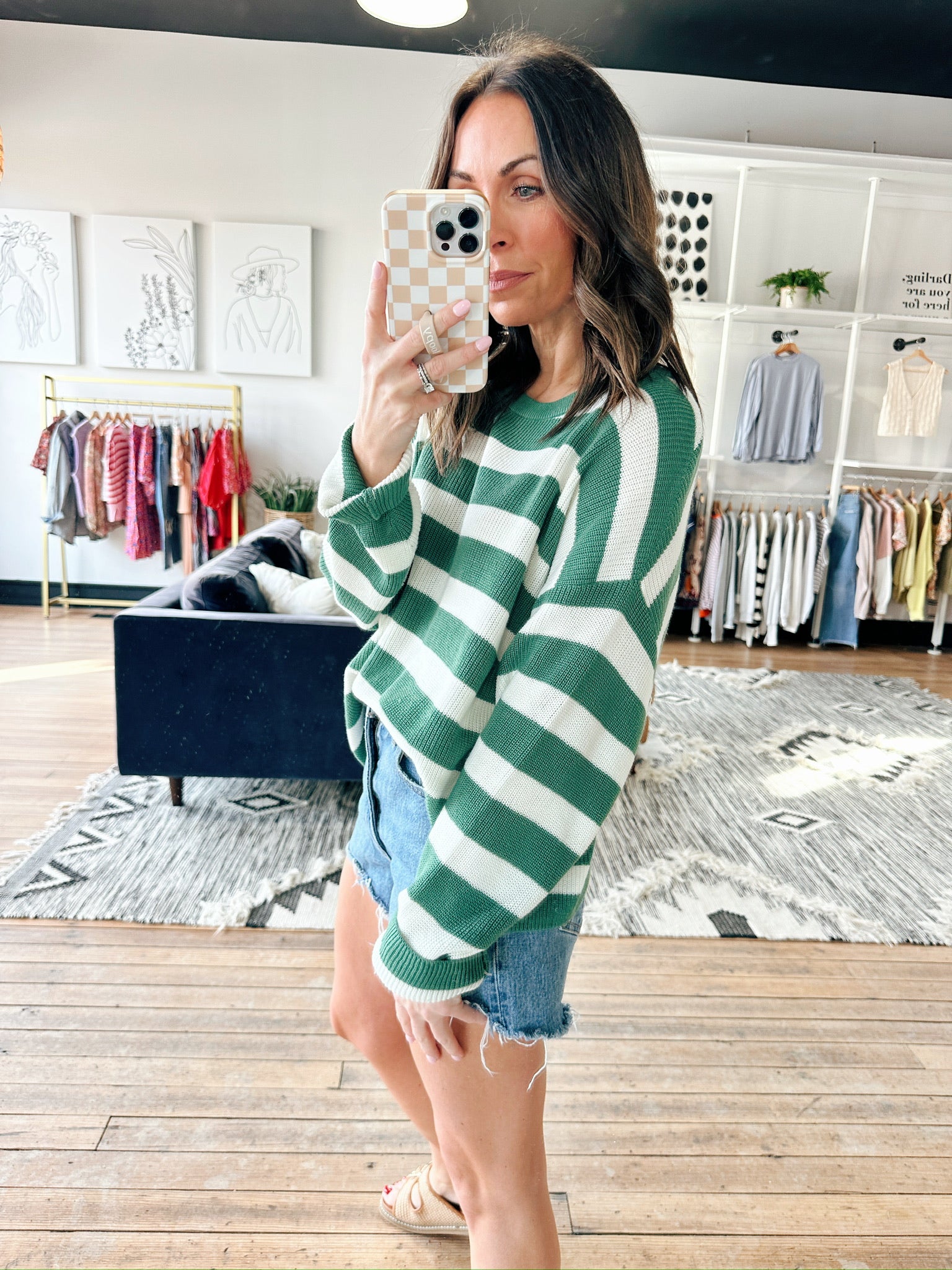 The The Workshop Blaire Cozy Stripe Top is a beautiful soft cozy knit long-sleeve top featuring classic green stripe detailing, a relaxed everyday silhouette, and an ultra-comfortable feel. It fits true to size with an easy, flattering drape — perfect for casual workdays, errands, lounging, or everyday wear. Made from a midweight cotton-blend knit, this piece adds effortless warmth and style without feeling bulky.