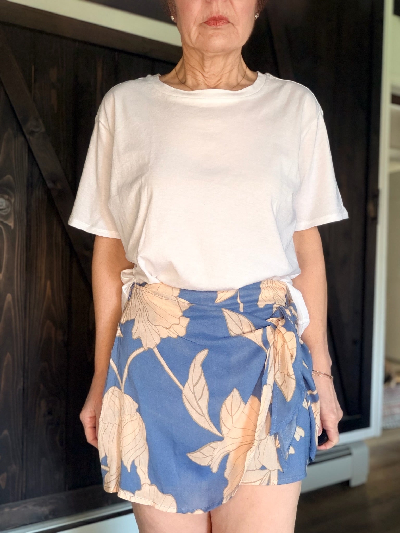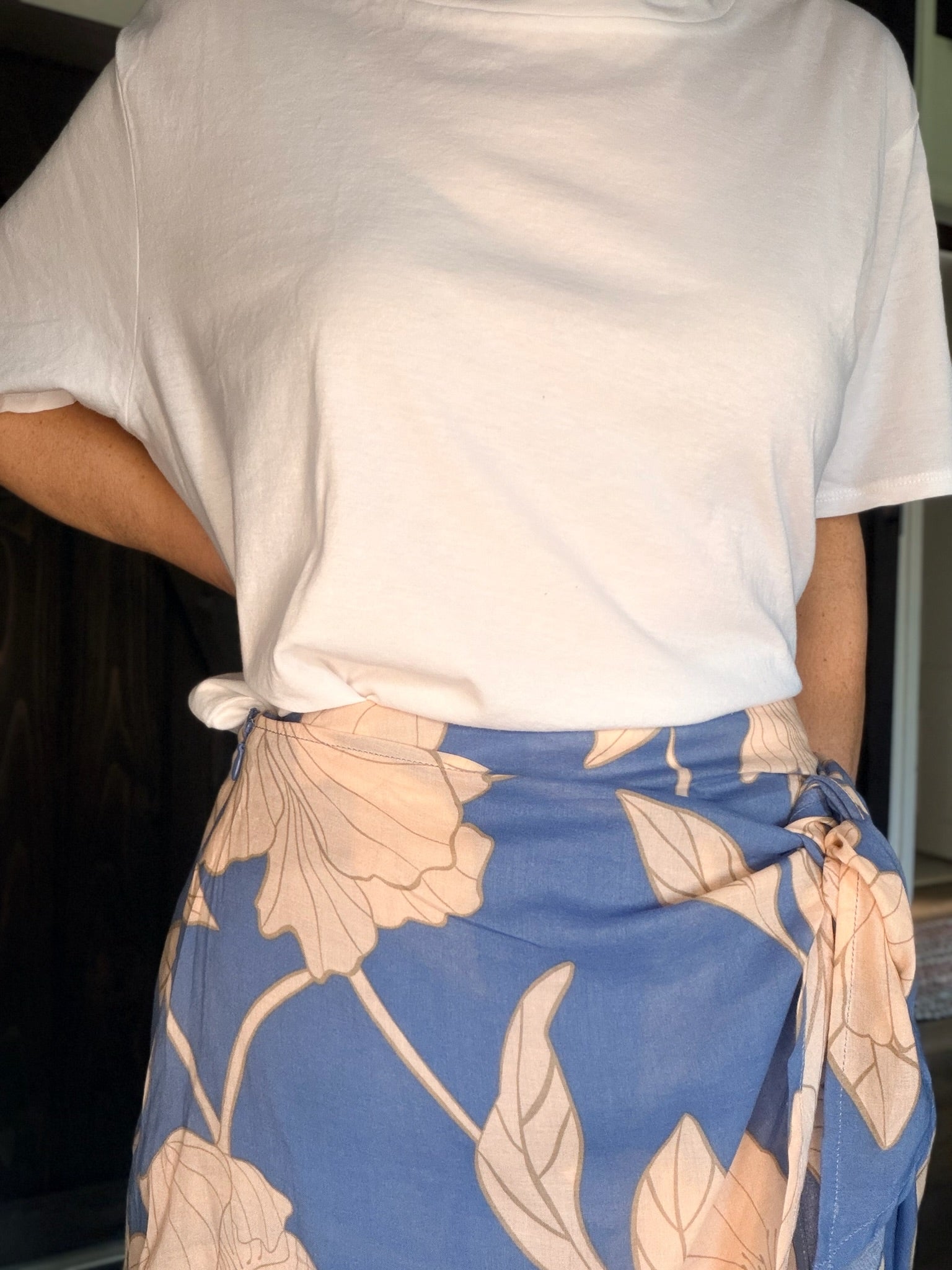 • Features: Floral print, wrap-style front, fixed tie detail, high-rise waist, lightweight feel, soft drape