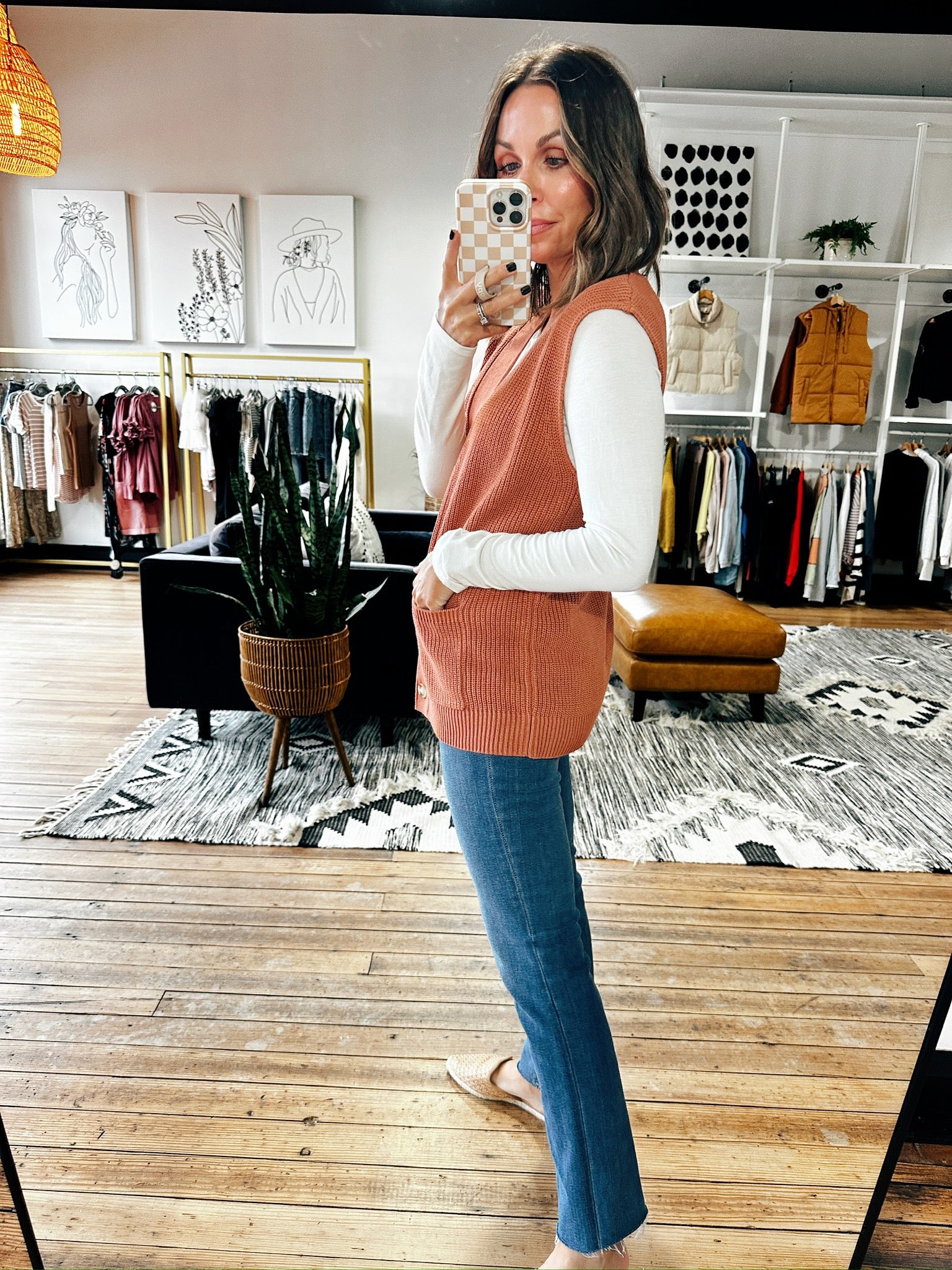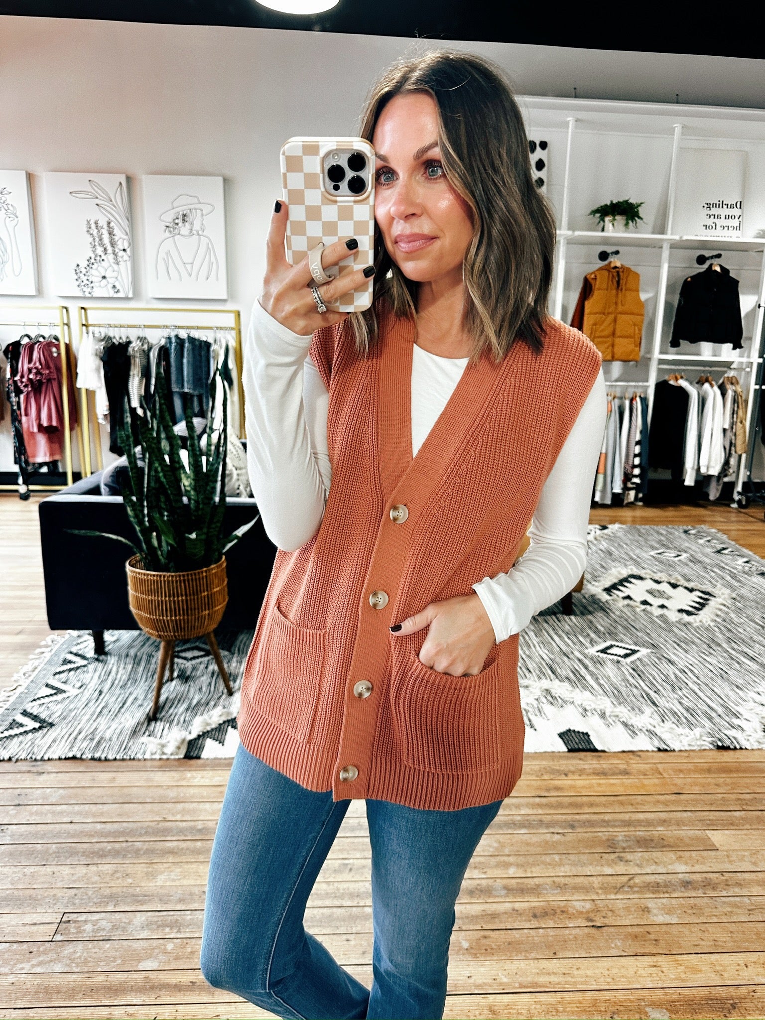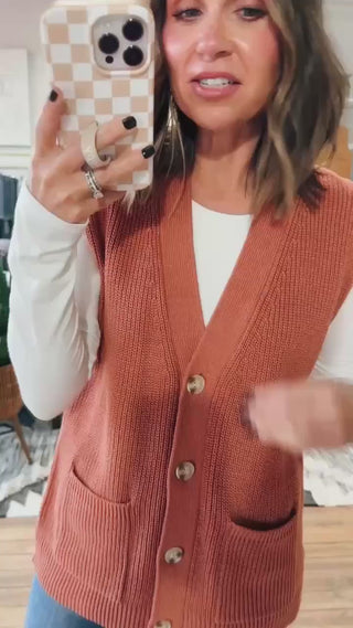 This terracotta color is truly the color of fall! This Spiced Cider Vest is a cute option to wear with a tee or long sleeve as we head into fall. It fits true to size, is a longer length, has pockets and buttons down the front.