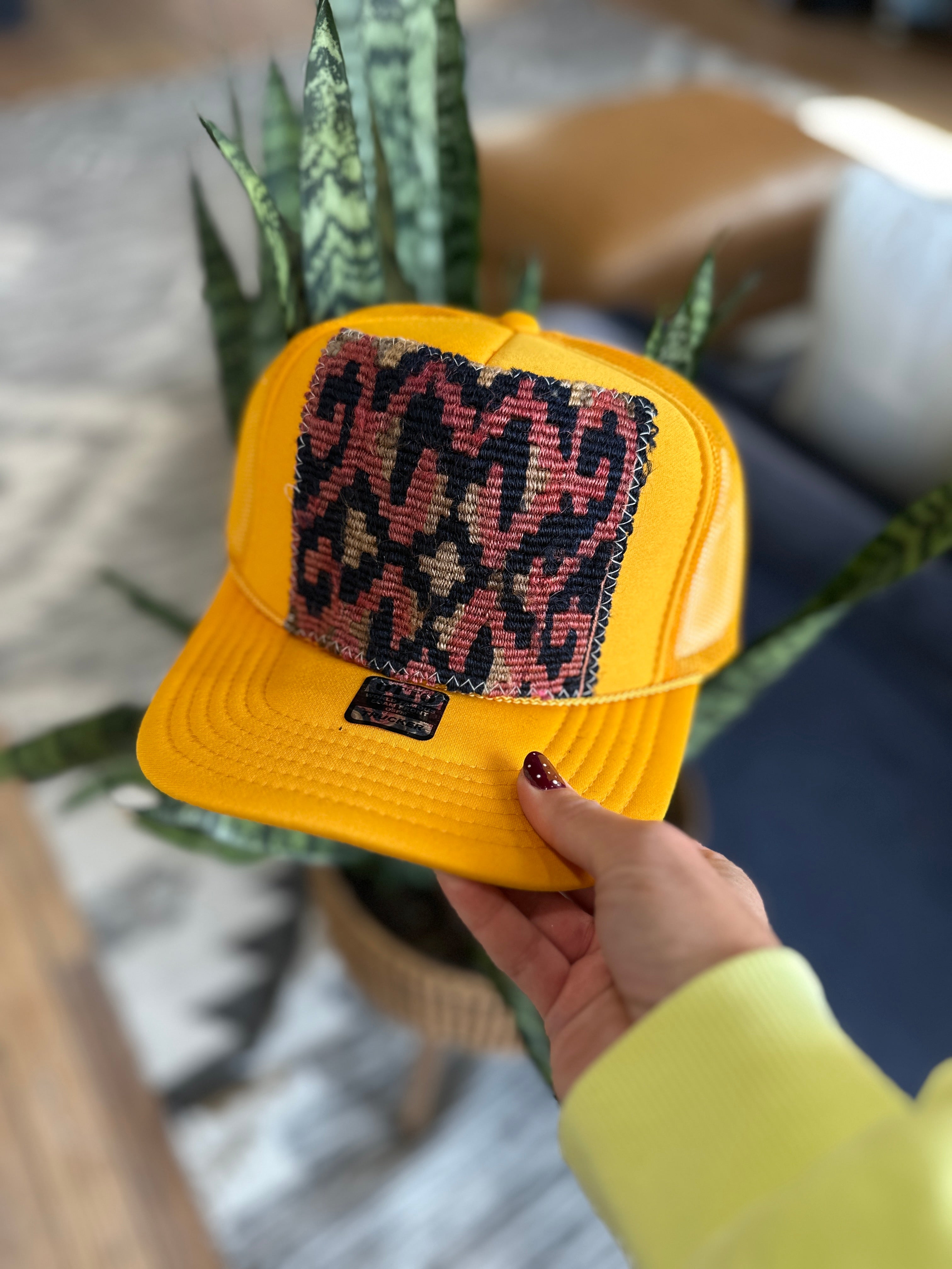 Your easy, throw-on-and-go, trucker hat with Turkish kilim patch. No two are alike! Truckers are one size hat with high crown, structured bill and mesh back with adjustable snaps.