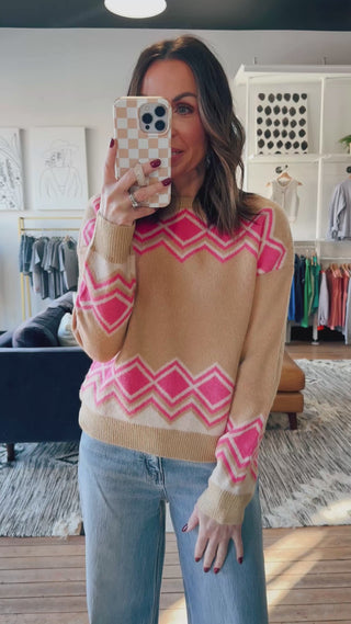 The Adeline Knit Crewneck Sweater is a fun printed sweater with a pop of pink! This fits true to size with a cozy style that pairs perfectly with denim and mules or boots! Crew neckline, standard length and soft knit material.