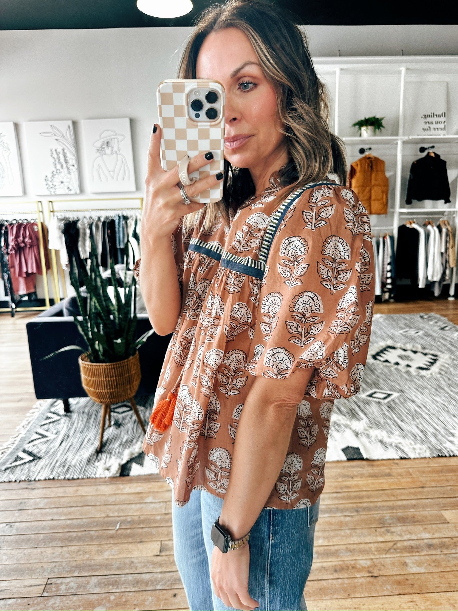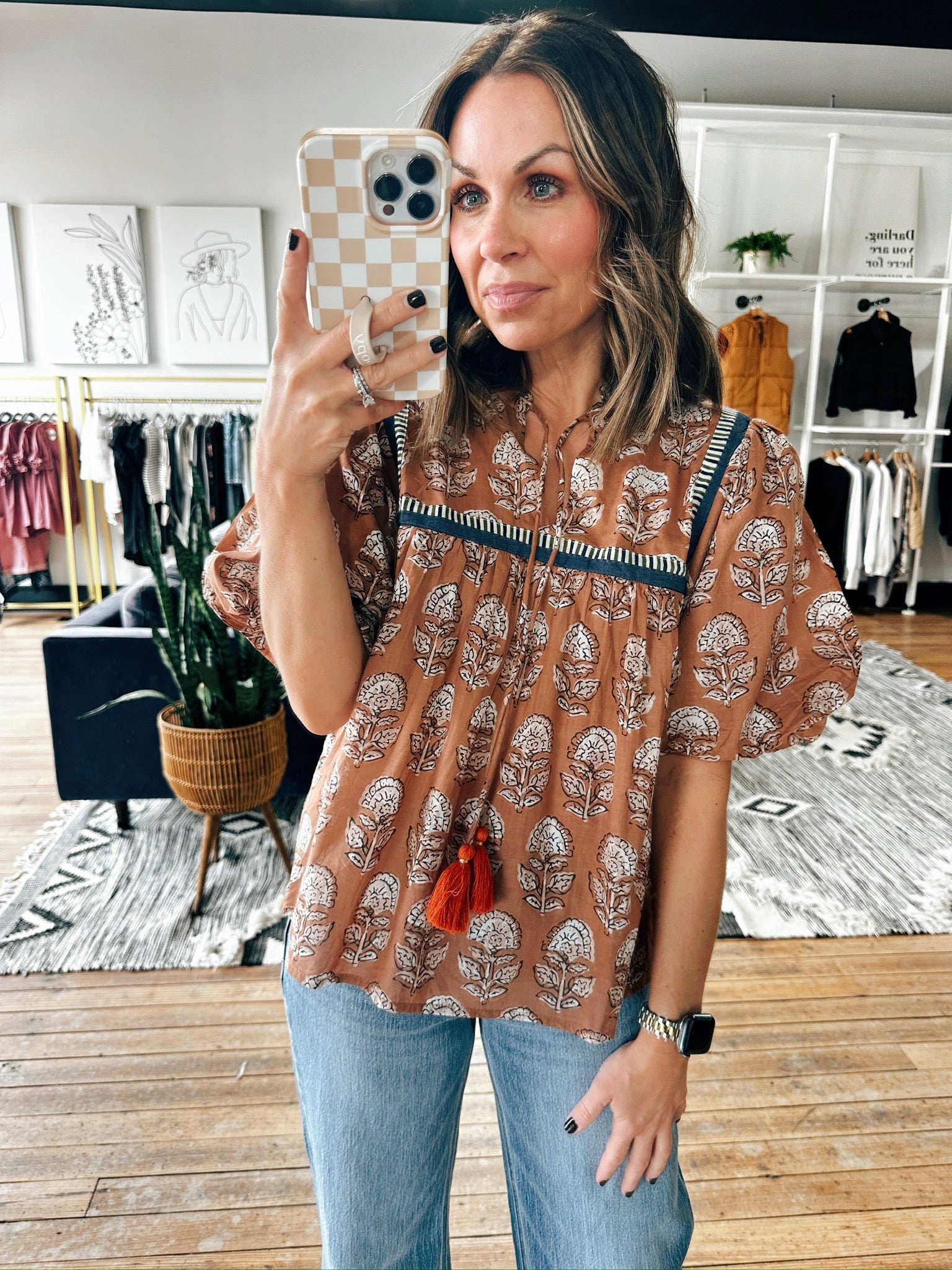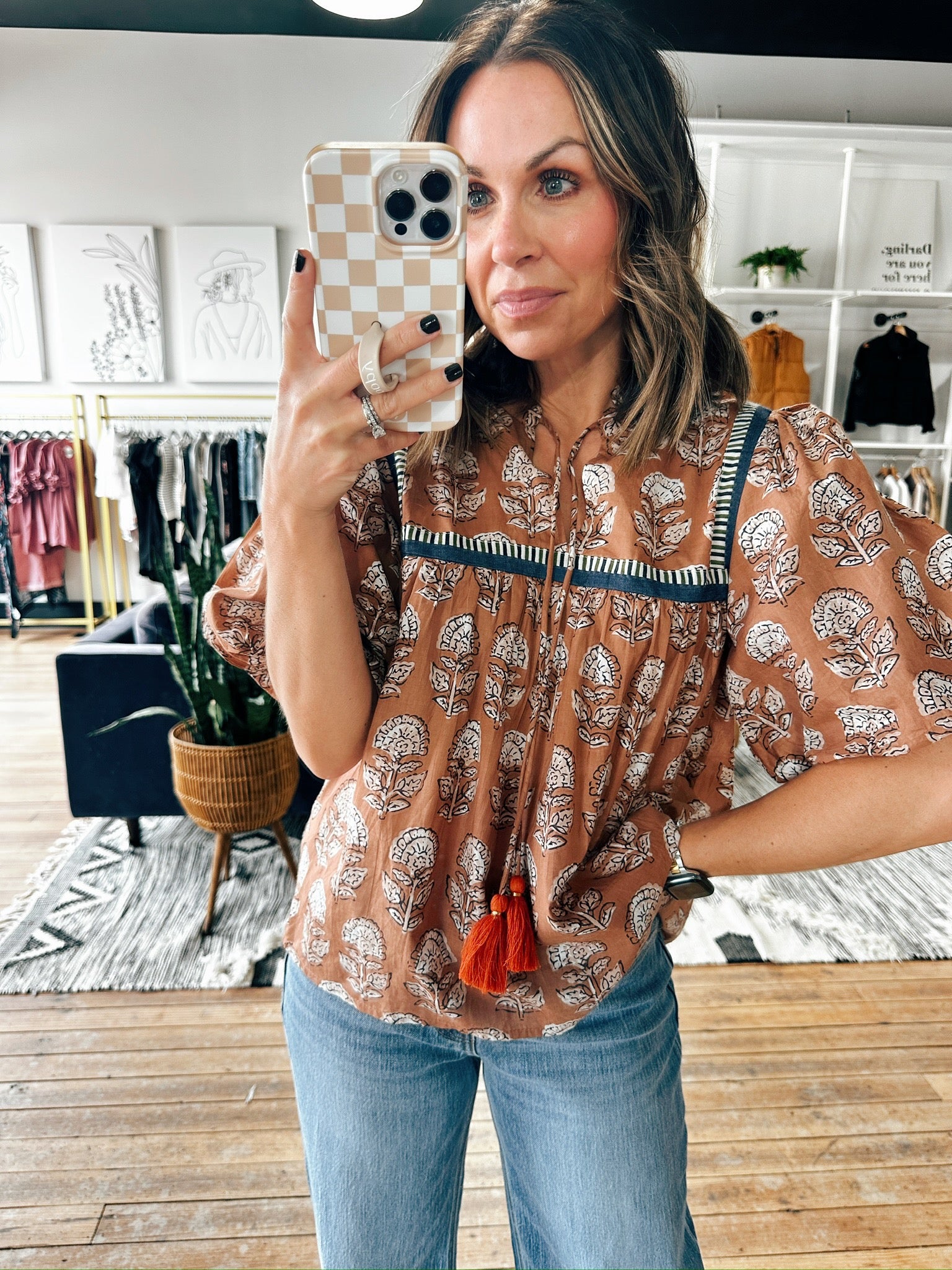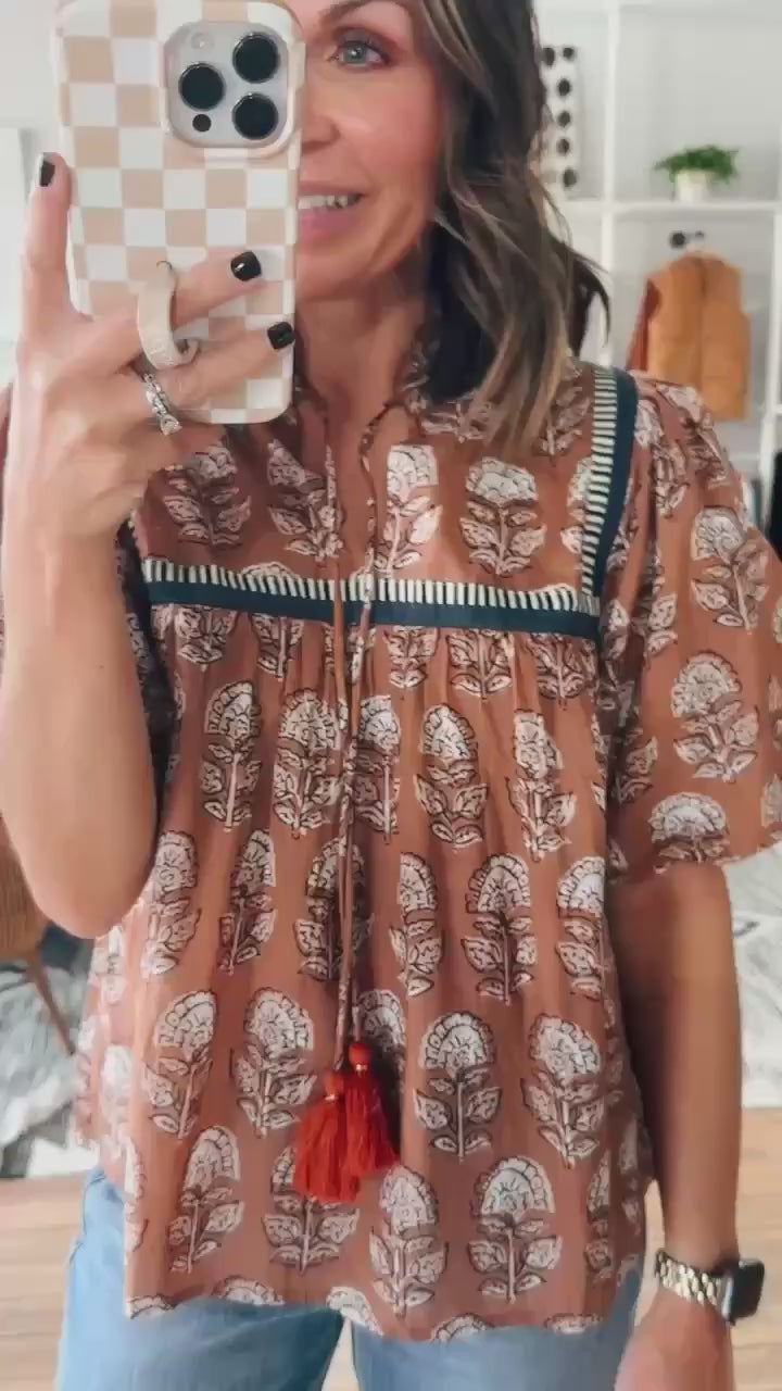 Embrace boho charm with our Puff Sleeve Floral Detail Tie Tassel Top. Designed with delicate floral embroidery, puff sleeves, and playful tassel ties, this lightweight and flowy blouse brings a feminine touch to any outfit. Perfect for the fall, it pairs beautifully with jeans, skirts, or shorts for a casual yet chic look.