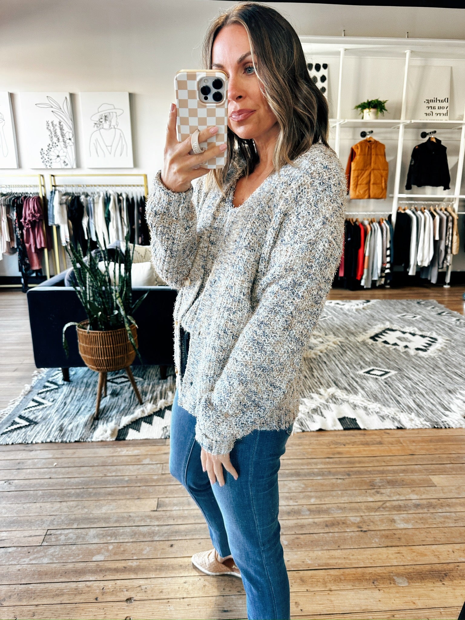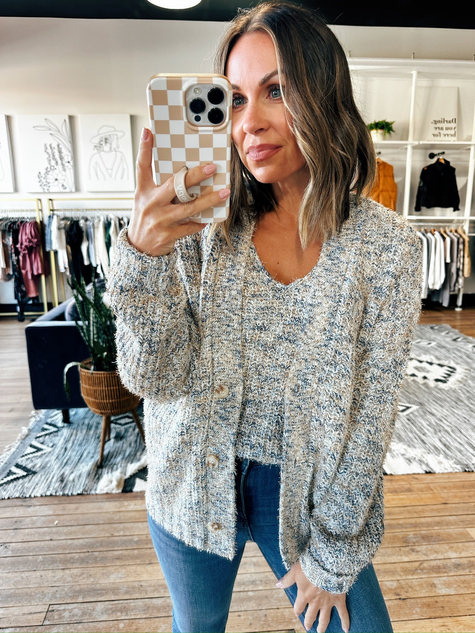 With its subtle mix of colors, the Paloma Cardigan pairs beautifully with denim, leggings, or even skirts—making it a go-to piece for everything from coffee runs to casual office days.