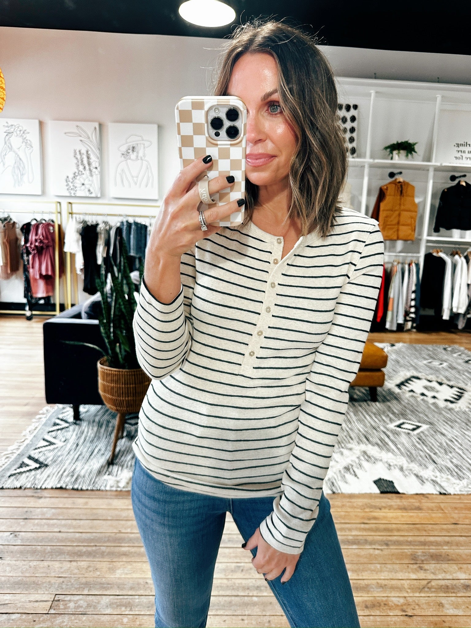The Eve Stripe Long Sleeve Henley adds charm to your wardrobe with its classic button-down front and fitted, true-to-size design. Its striped pattern brings subtle style, while the longer length makes it easy to tuck in or wear as is. This versatile henley is perfect for everyday top for fall that can be layered with a vest as the weather gets chilly!