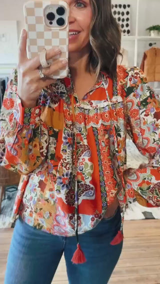 Bring a playful, boho-chic vibe to your look with our Patchwork Print Ruffled Collar Top. Featuring a vibrant patchwork print, a ruffled neckline, and tassel tie details, this top brings pretty feminine charm. True to size and perfect to pair with denim or dress pants!