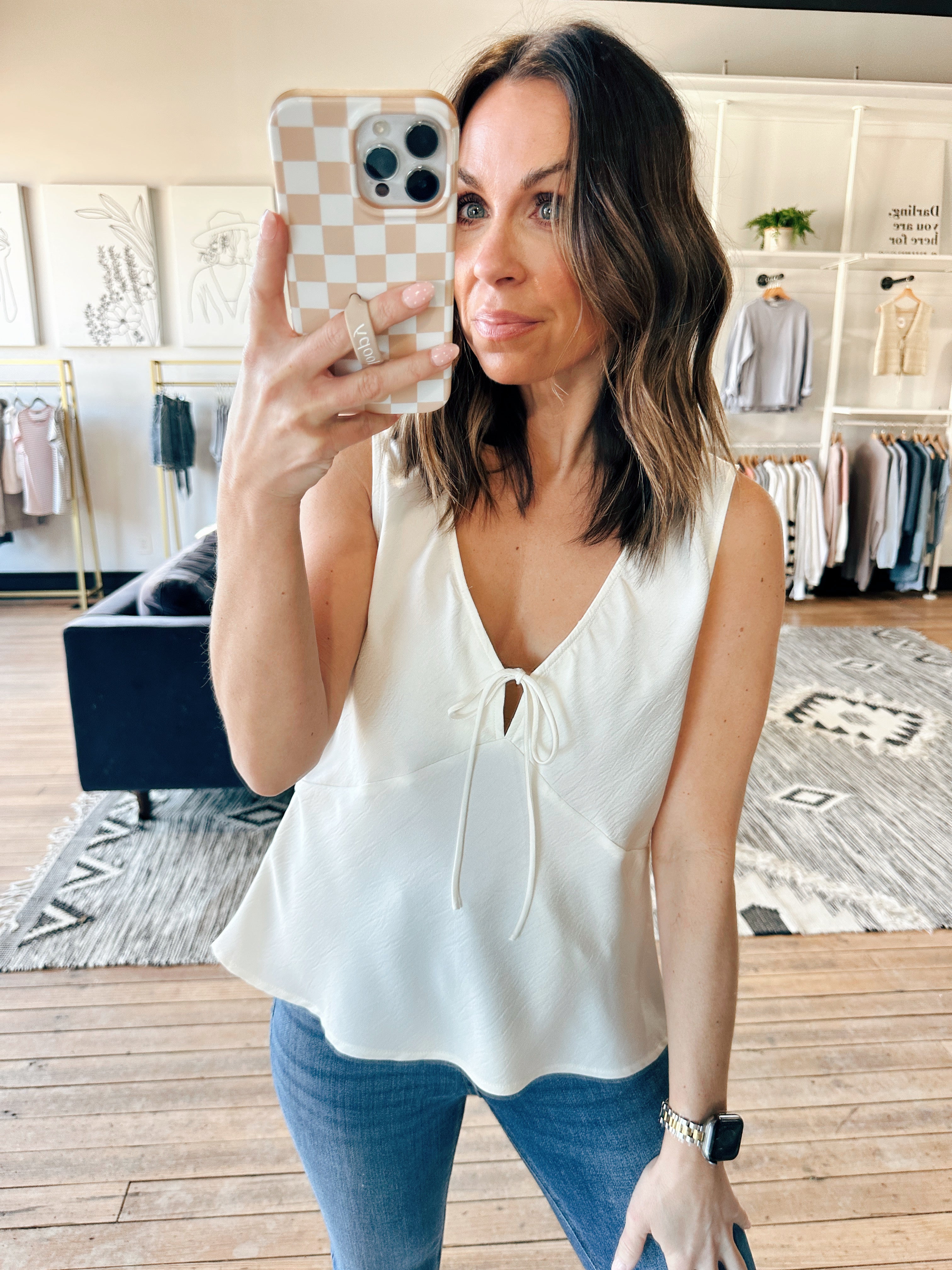 • Features: Silky satin finish, V-neckline, sleeveless design, front tie detail, lightweight feel, subtle sheen