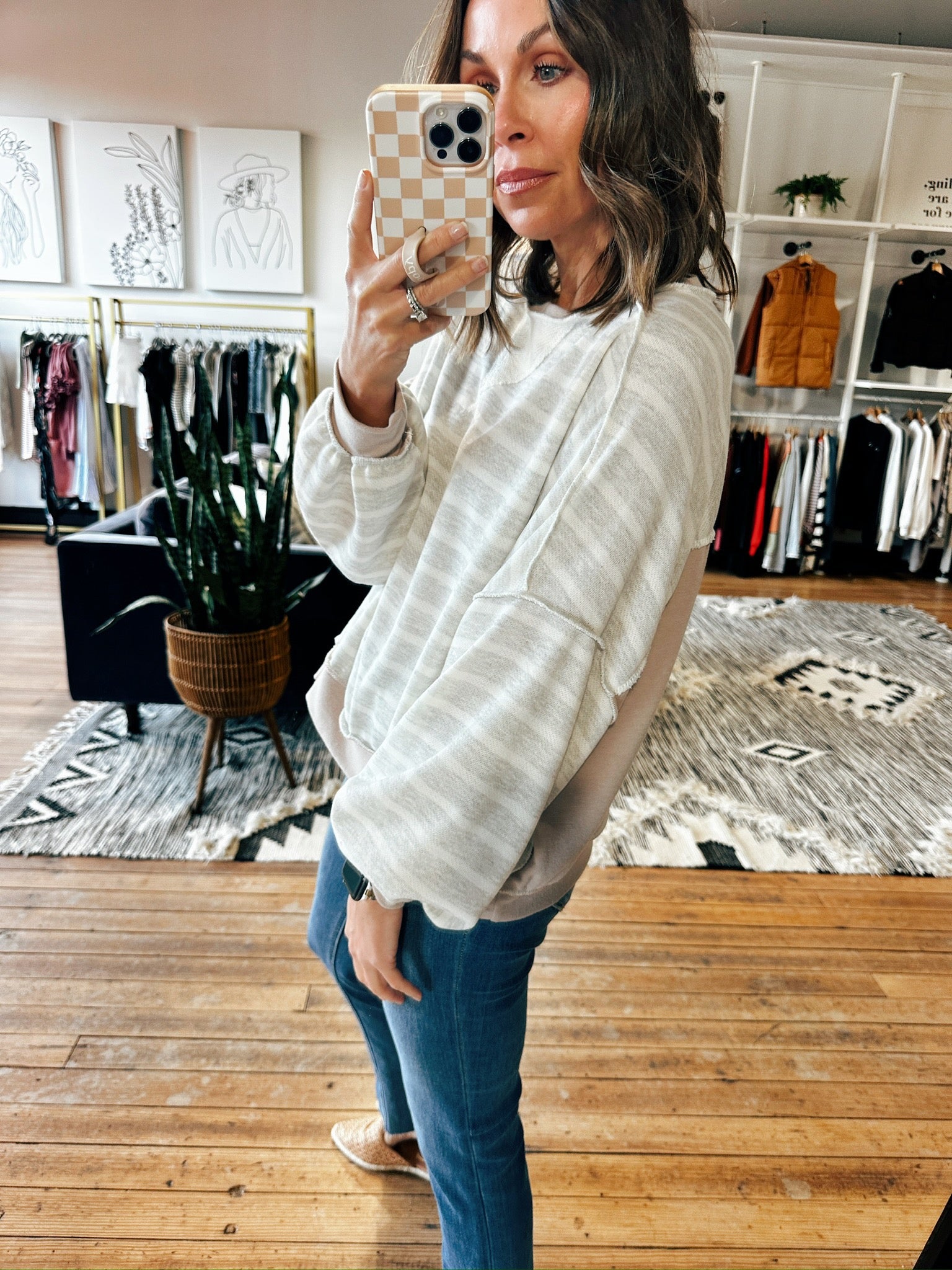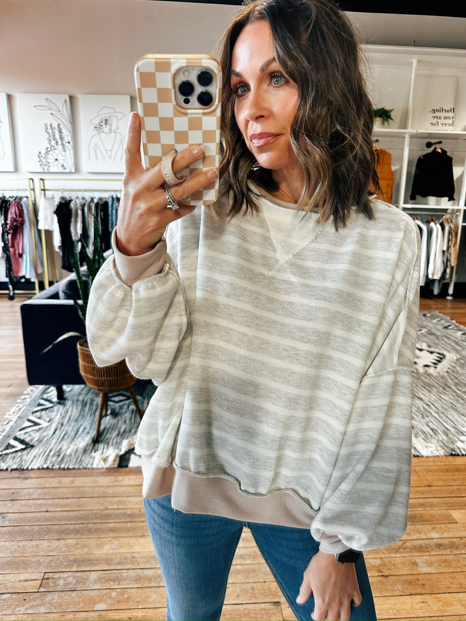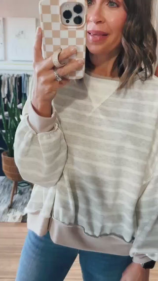 A boho staple, this color block stripe pullover knit top is designed in soft French terry for a casual, cozy oversized fit. We love the balloon sleeves and neutral color palette that will work great with denim and mules or booties!