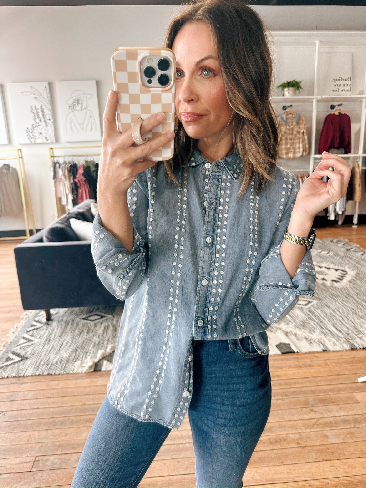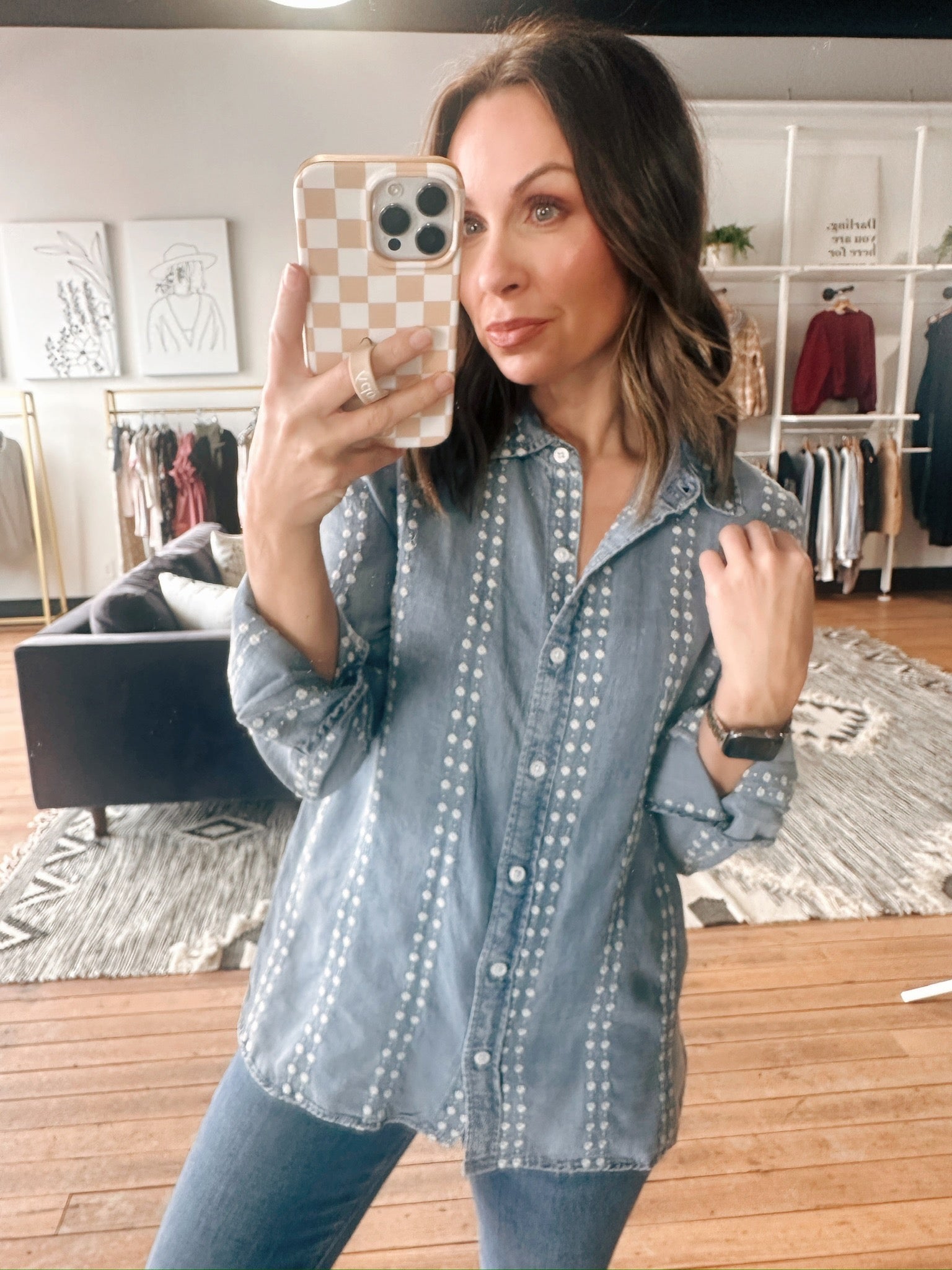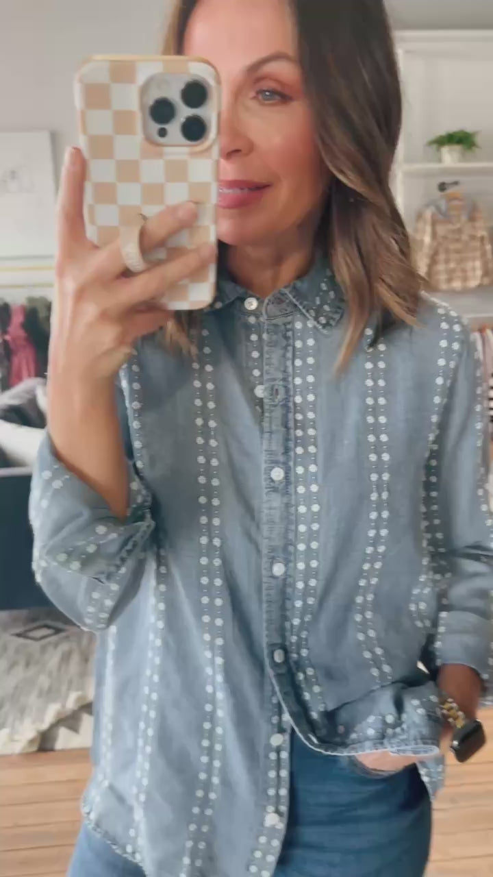 The Natalia Shirt is an easy option to throw on any day of the week! Made from soft woven fabric, it features a classic collared neckline, button-front closure, and long sleeves for a relaxed yet polished fit. True to size and has a fun striped print detail.