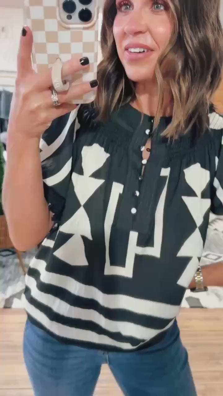 We are loving this fun geometric print on this blouse! This fits true to size with a flowy style and button detailing at the neckline. This is a great blouse for pairing with denim or dress pants for work!