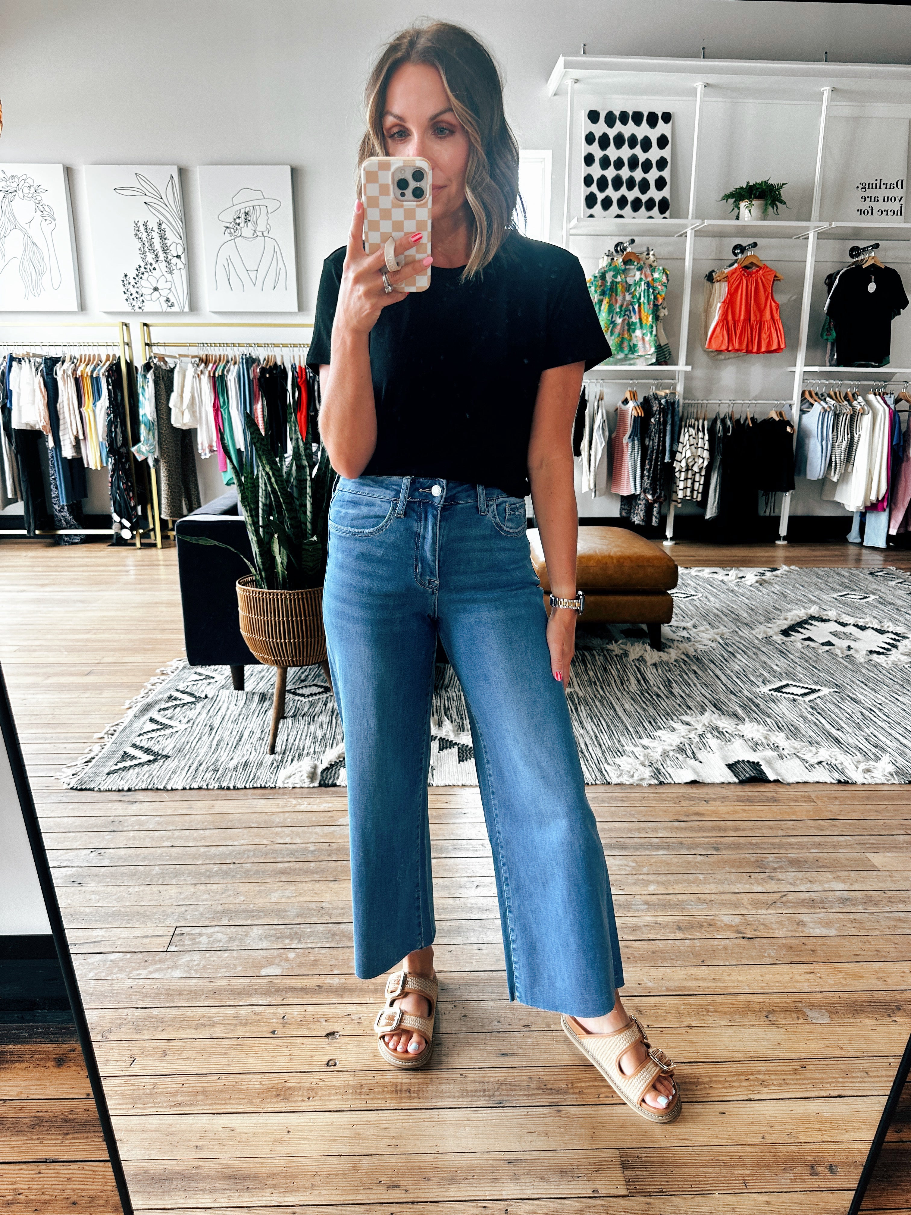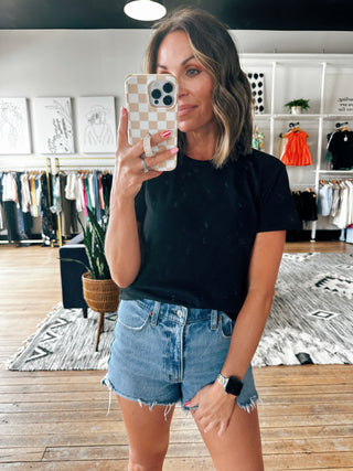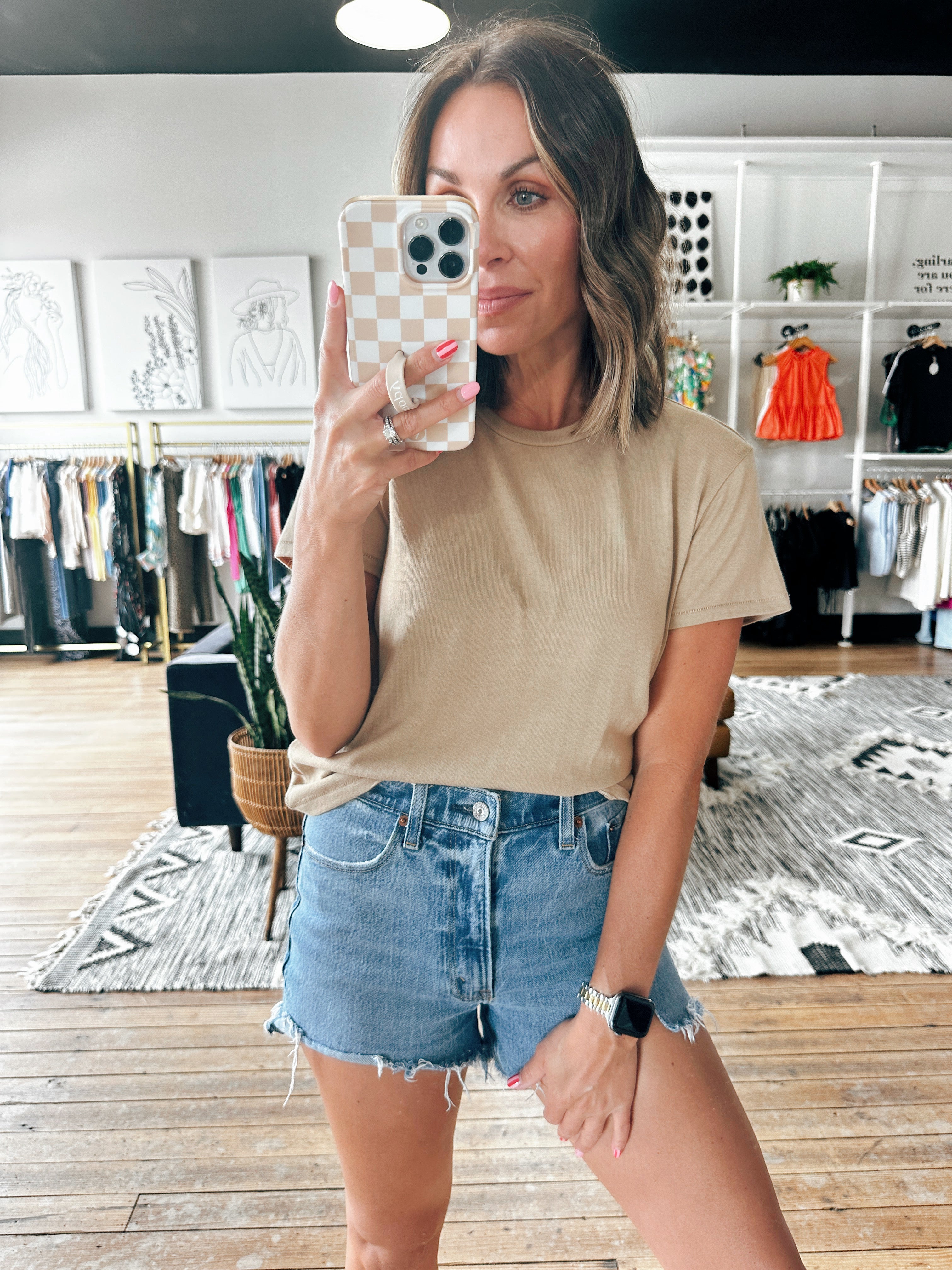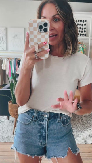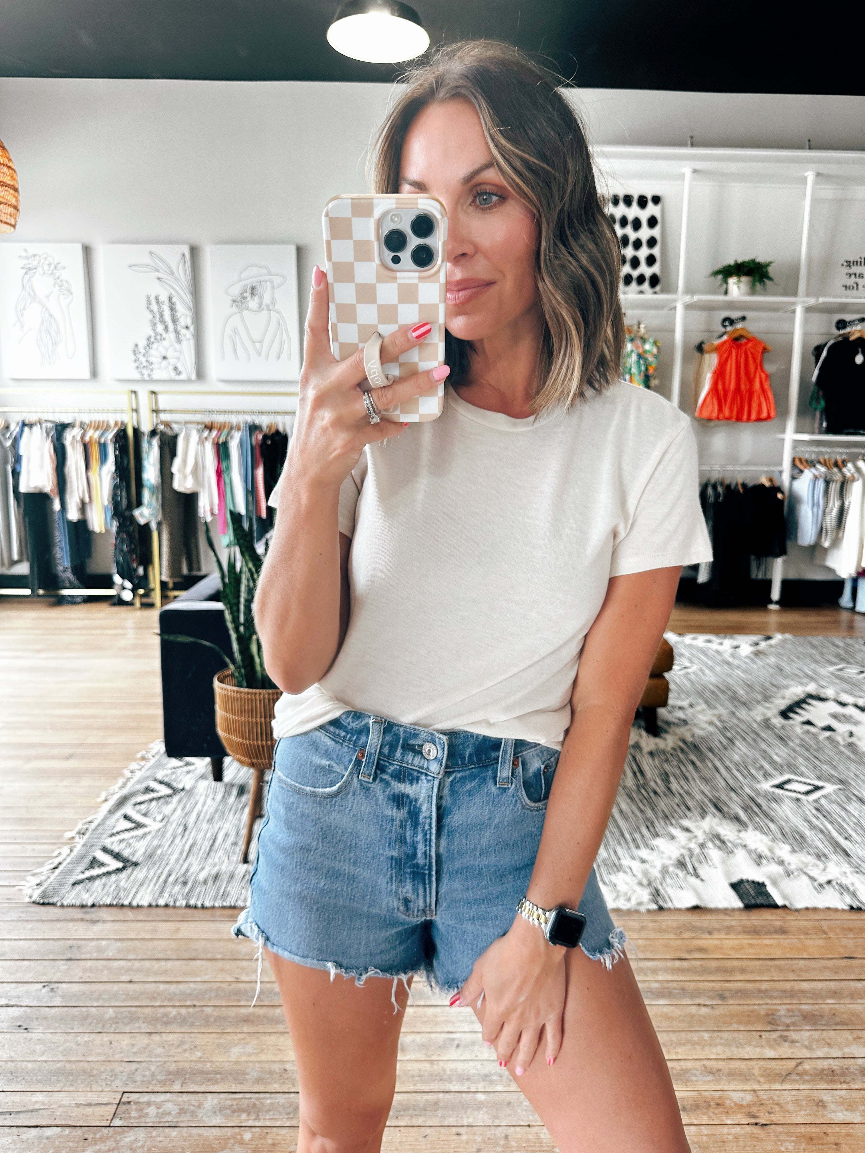 A simple staple in three color options! It fits true to size with short sleeves and a standard length. This is a great tee to pair with denim or tucked with trousers. A go-to easy option that is also from a quality brand!