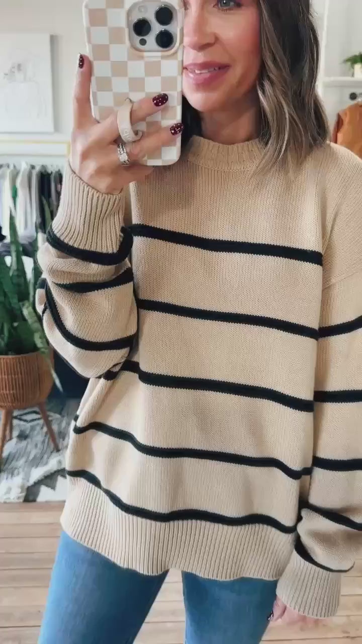 Available in two versatile shades—camel with black stripes and ivory with grey stripes—you’ll find yourself reaching for this sweater again and again. Pair it with your favorite denim for an effortless everyday look, or layer it over leggings for that cozy, off-duty vibe.