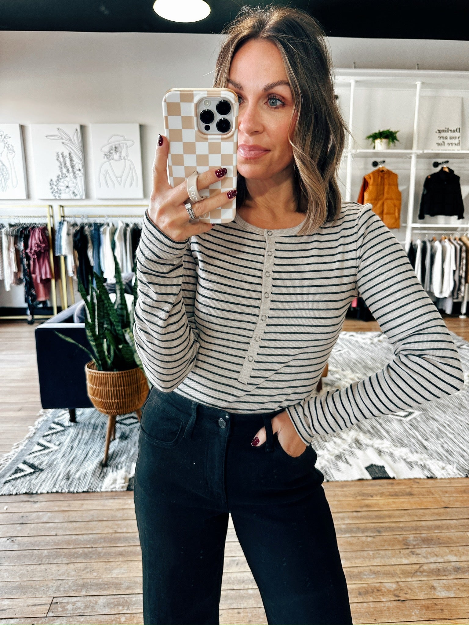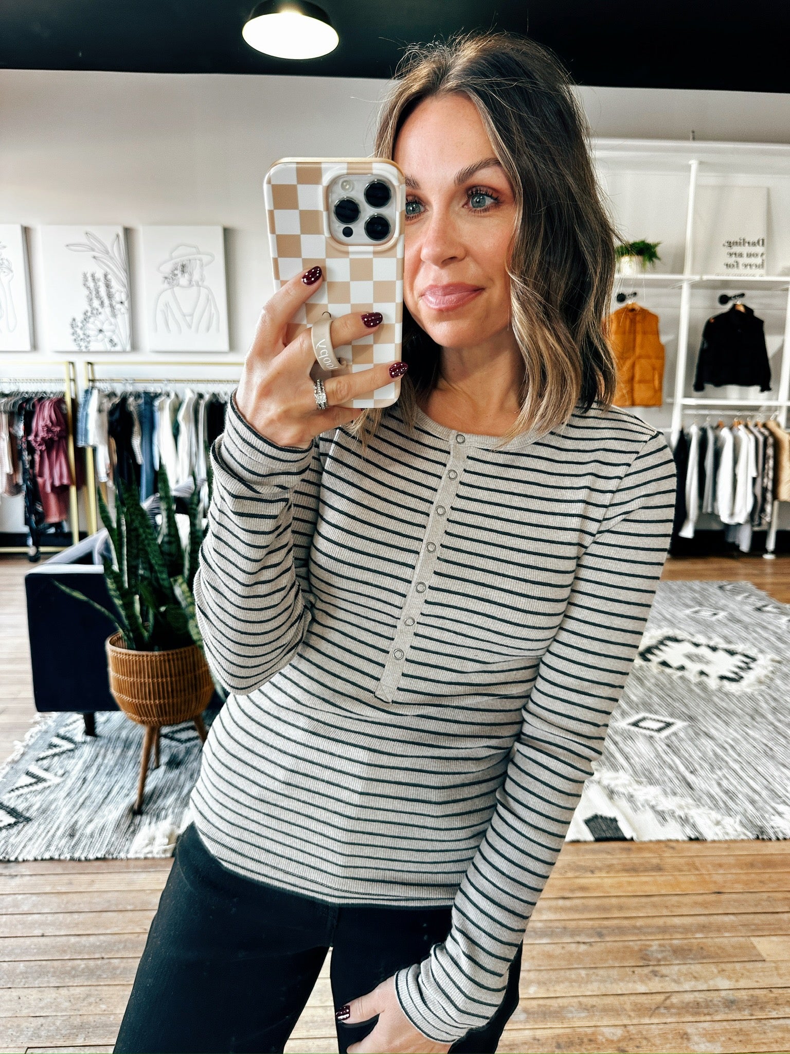 A timeless staple with a casual-chic twist, the Stella Stripe Henley is your new everyday essential. Designed in a soft heather taupe base with thin black stripes, this women’s long-sleeve top brings just the right amount of classic detail. The henley-style button placket adds a touch of versatility—wear it buttoned for a polished look or slightly open for a relaxed vibe.
