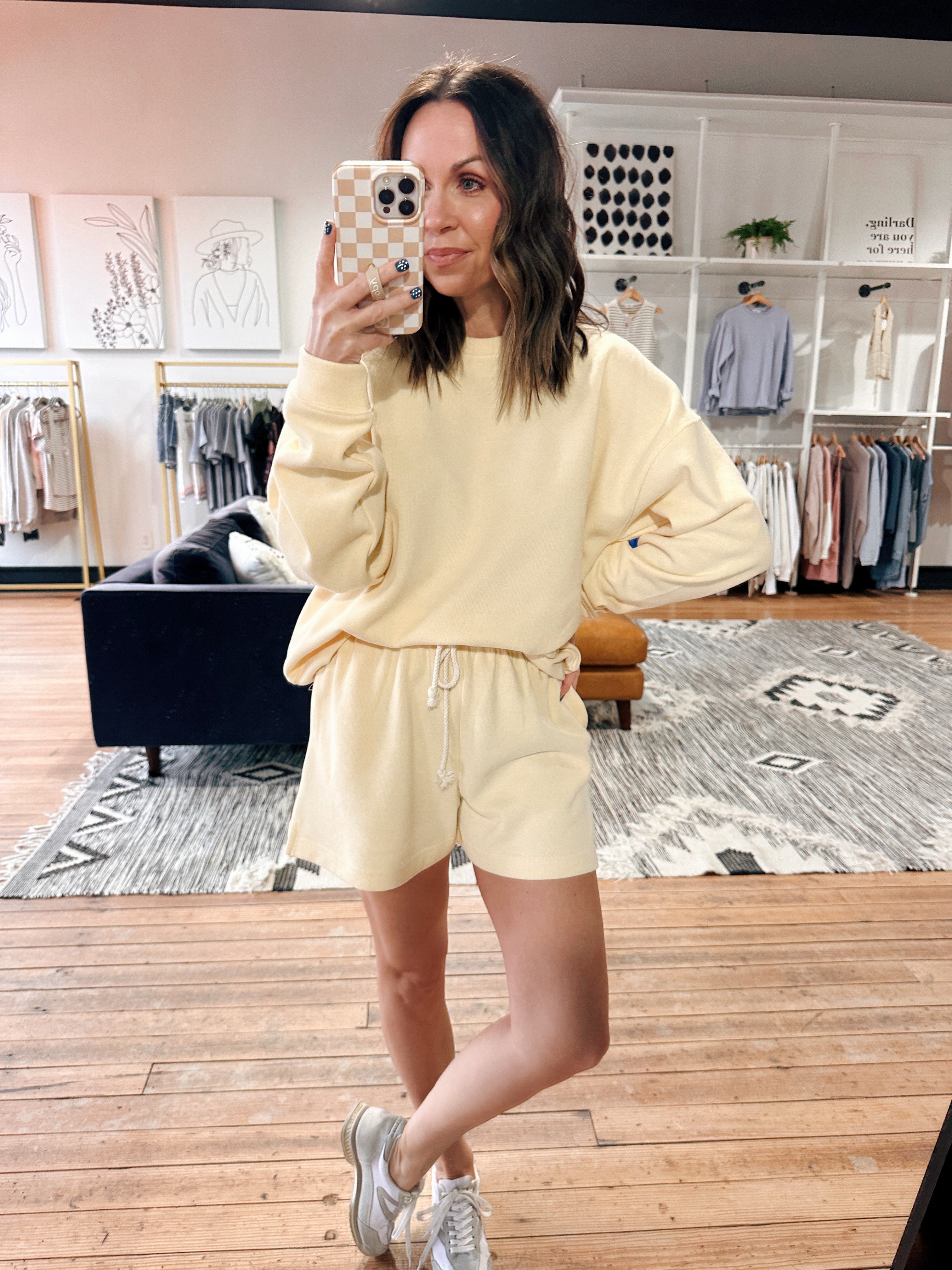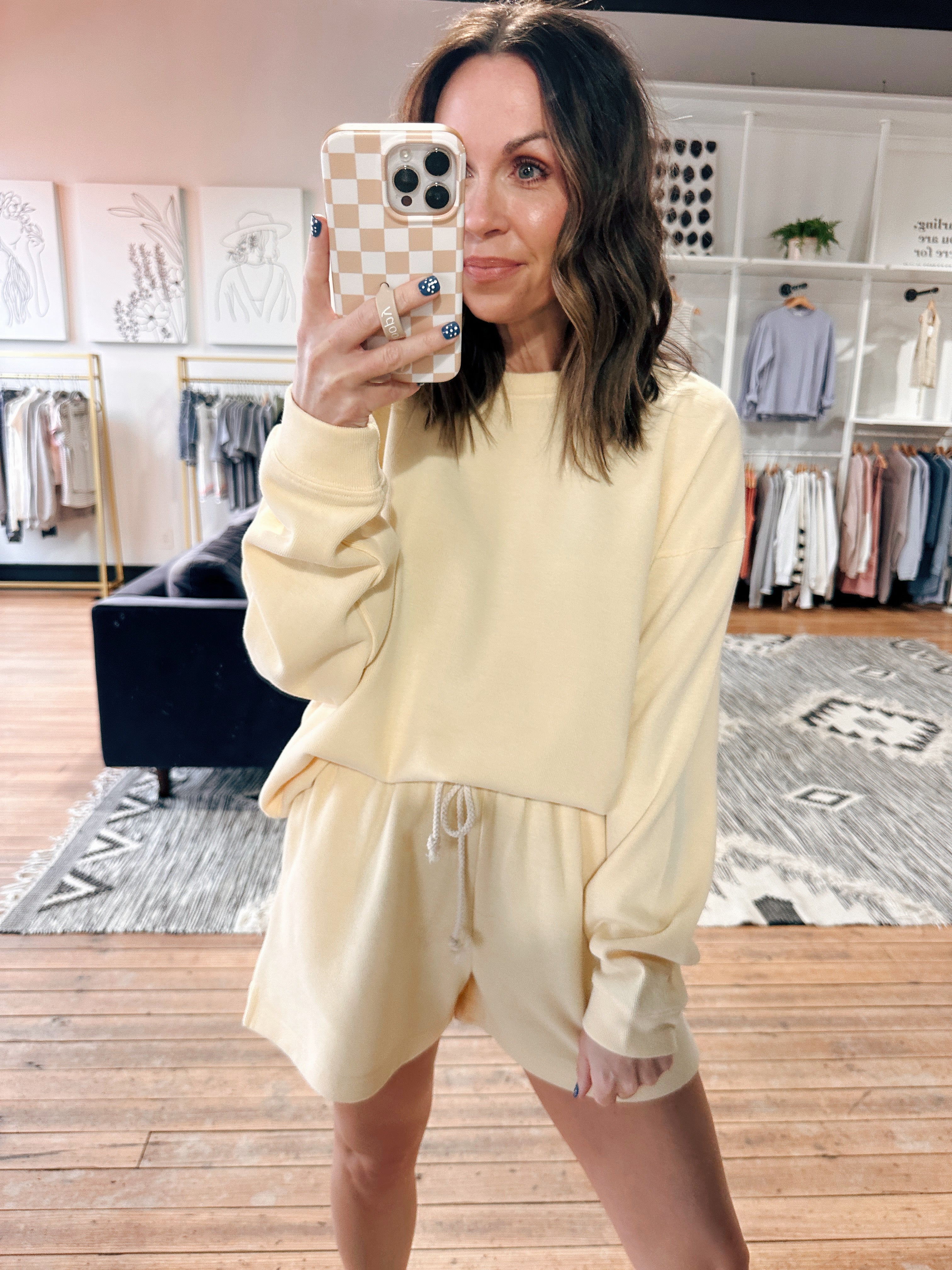 The soft lemon hue adds a fresh pop of color that’s perfect for spring lounging, casual errands, or travel days. Wear the pieces together for a full set moment or mix and match with your favorite denim or tees.