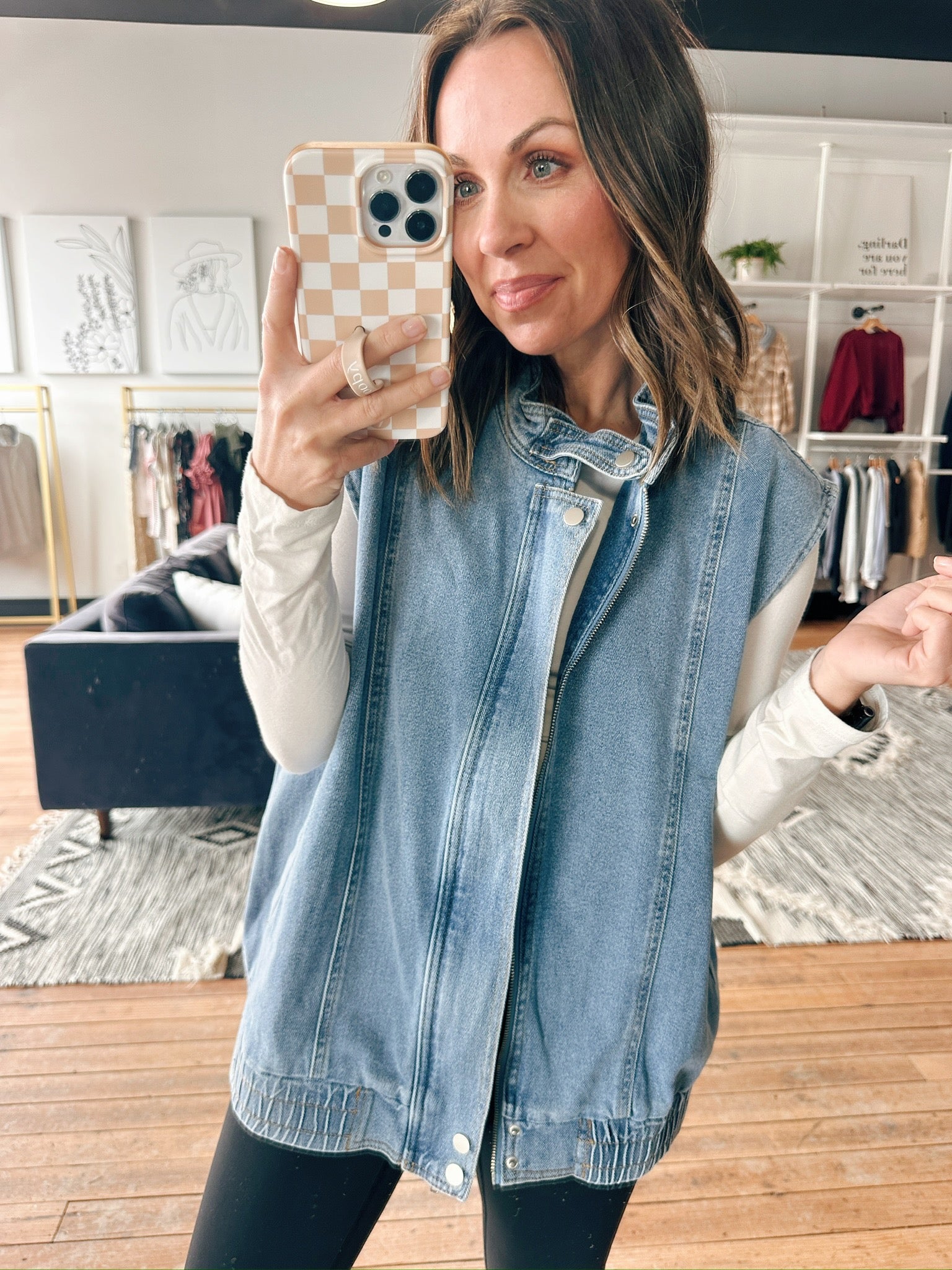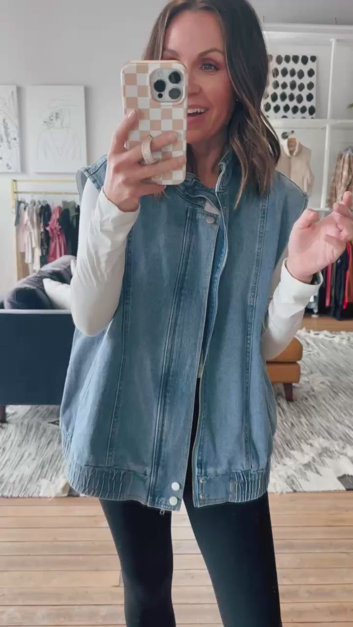 Elevate your casual chic look with the Julia Denim High-Neck Vest — a perfect blend of boho edge and modern utility. Designed with both snap button and zip closure, this lightweight denim vest offers versatile styling for women’s fall and spring fashion. The elastic waistband flatters your shape while ensuring comfort, and the side pockets add a practical touch. Layer it over a lace top, sweater, or long-sleeve tee for an effortlessly cozy yet stylish outfit.