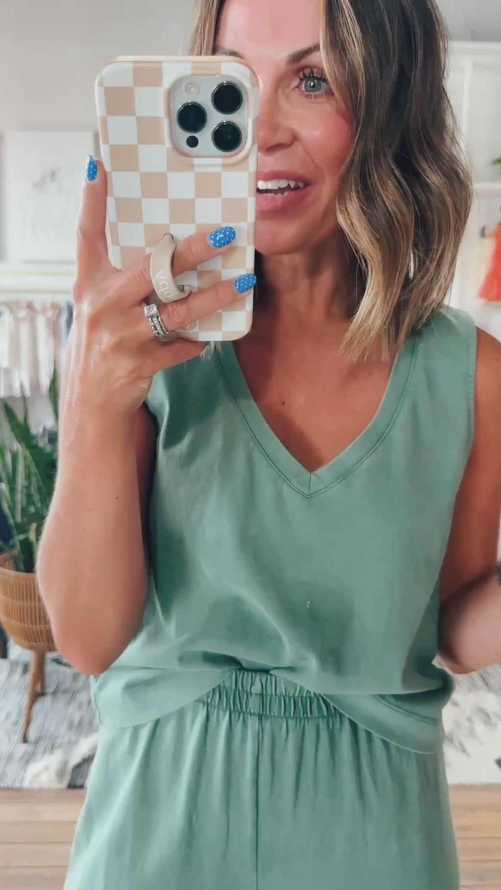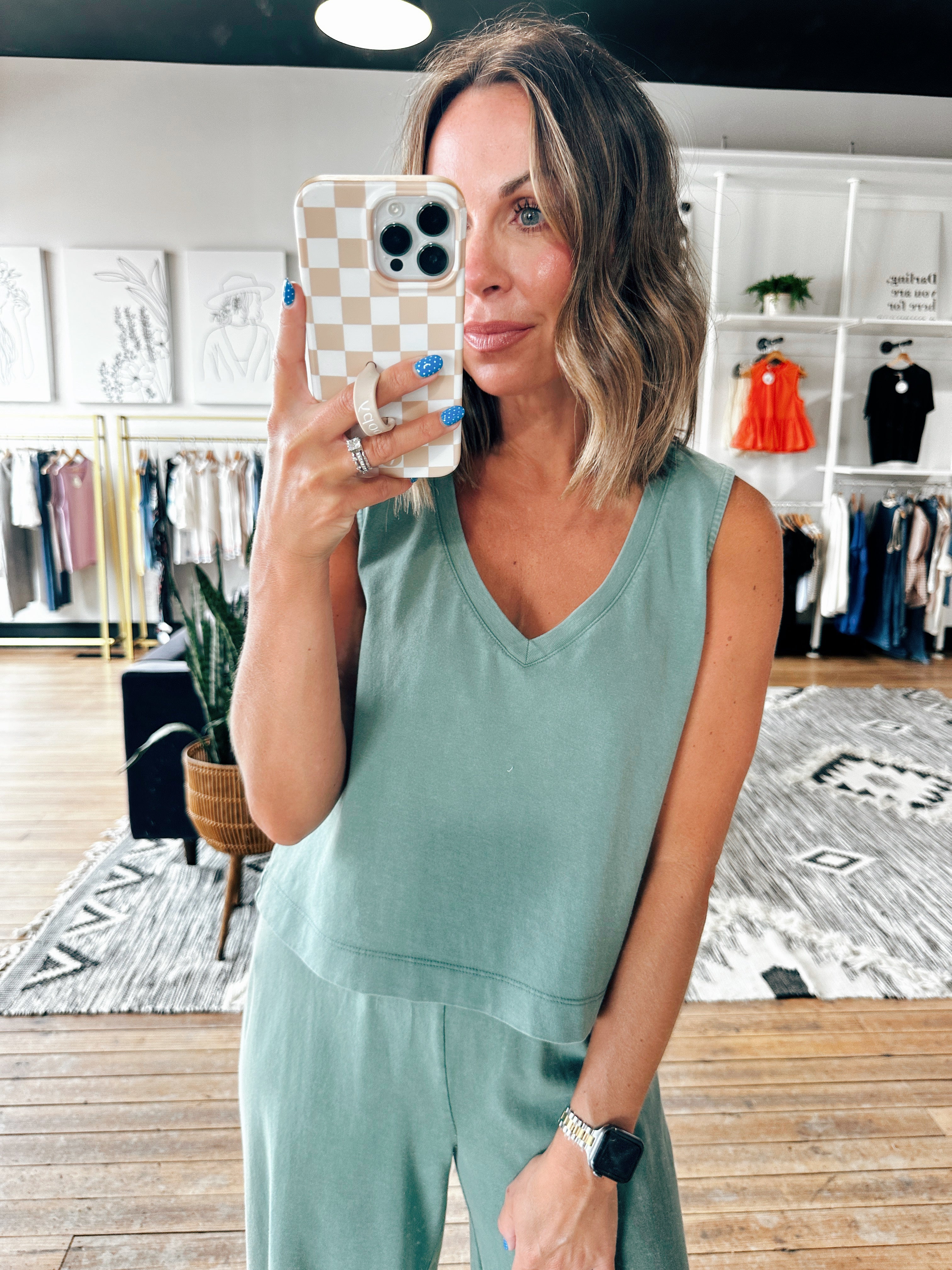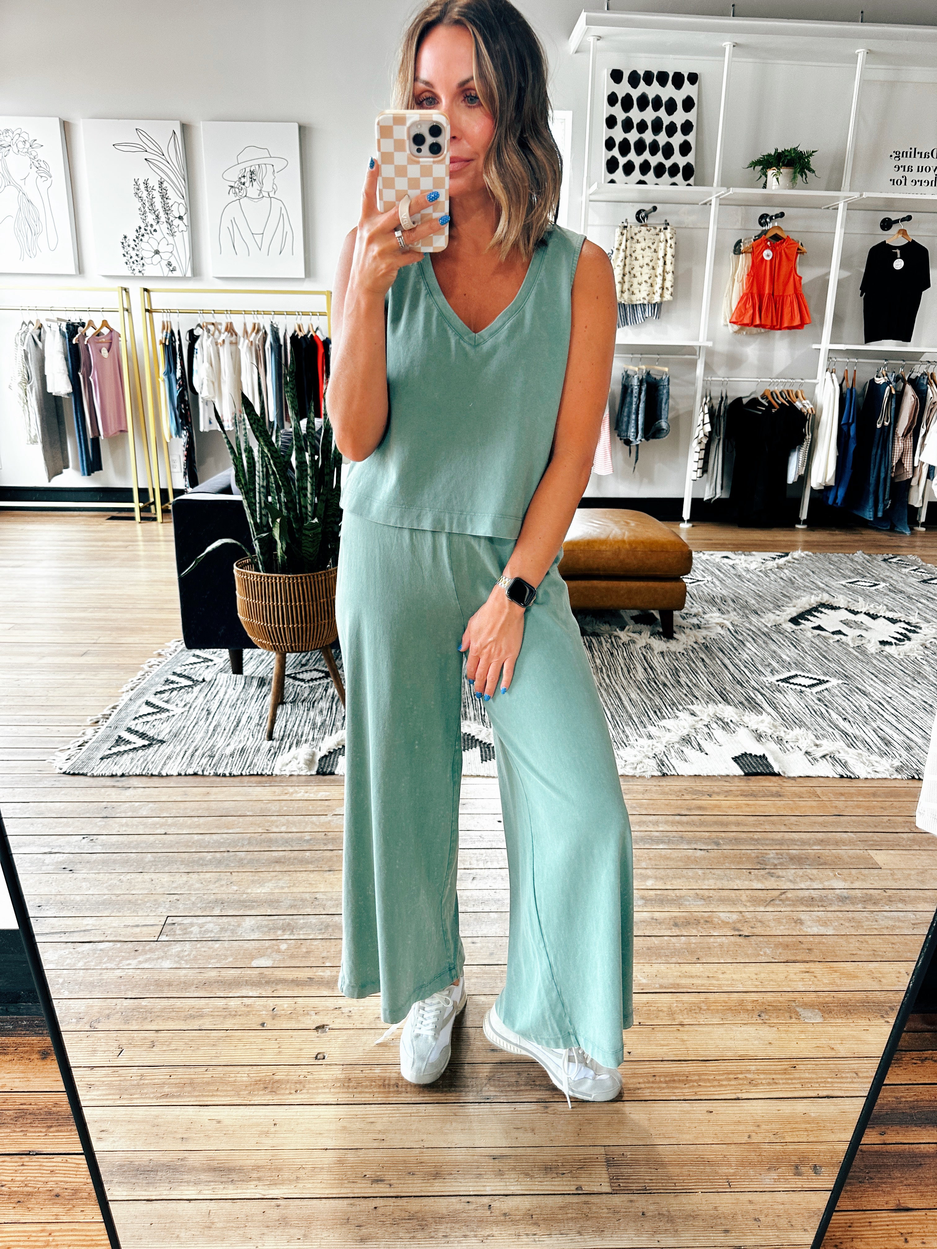 This hunter green color is perfect as we head into fall! This is a super cute set that is sold separately from one of our favorite quality brands! This v-neck tank fits true to size with a lightly crop length. It looks cute with the matching pants, or with other items in your wardrobe!